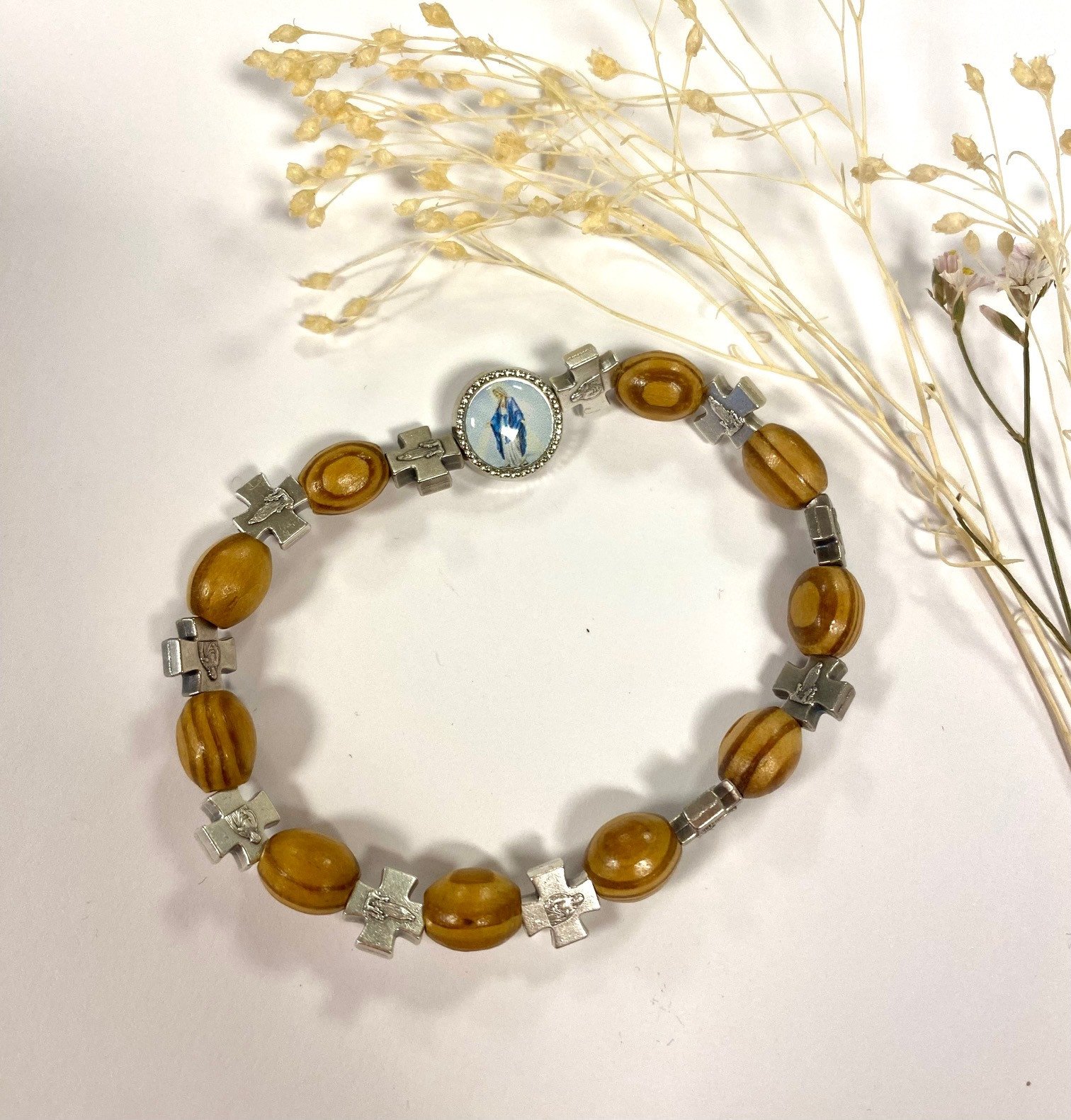 Très beau bracelet dizainier Vierge Miraculeuse monté sur élastique, composé de 10 perles ovales en bois clair d'une hauteur de 11 mm séparées par de fines petites croix en métal présentant différents sujets.