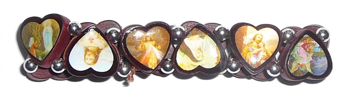 Bracelet sur élastique composé de médailles en bois en forme de coeur des saints protecteurs.