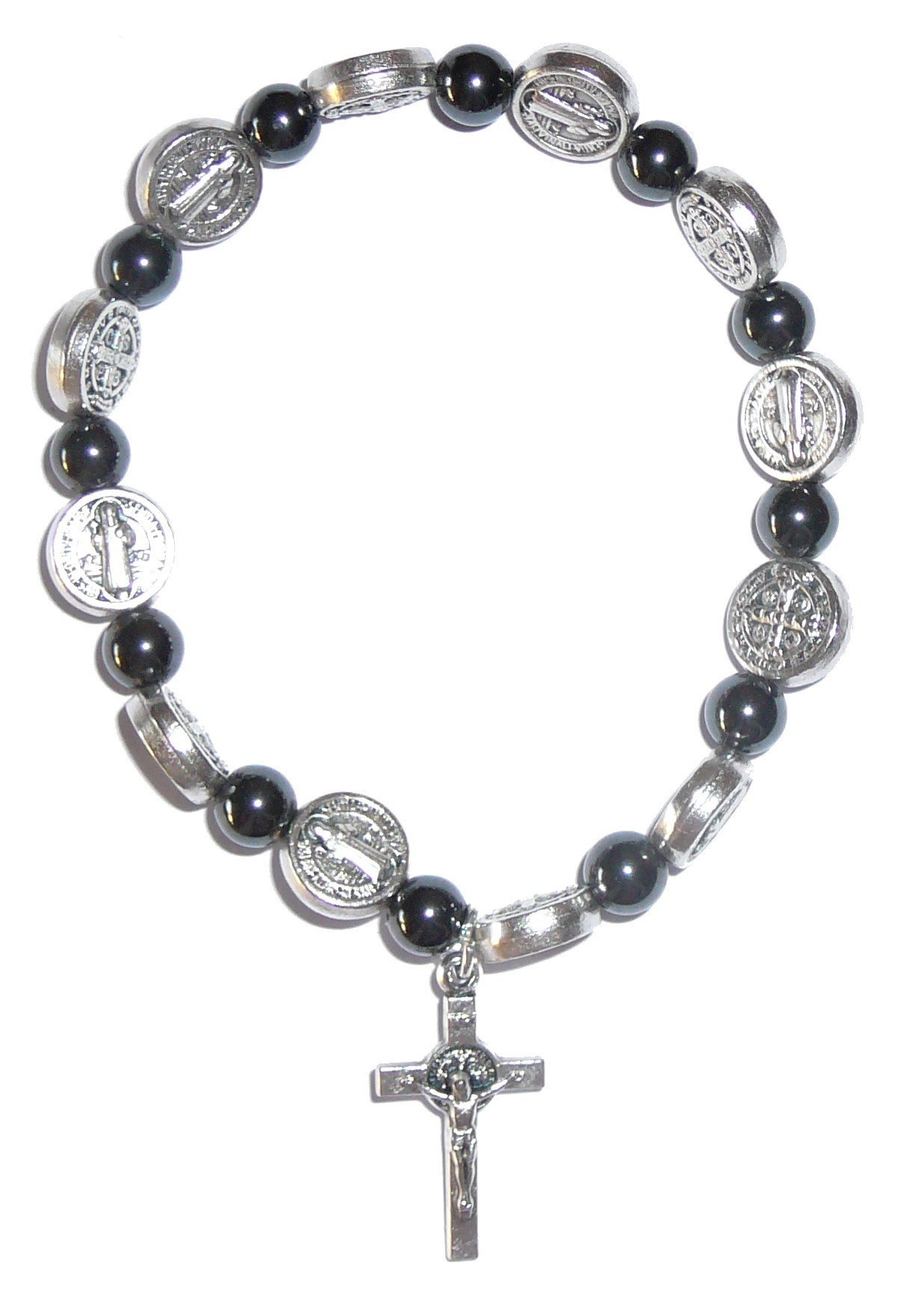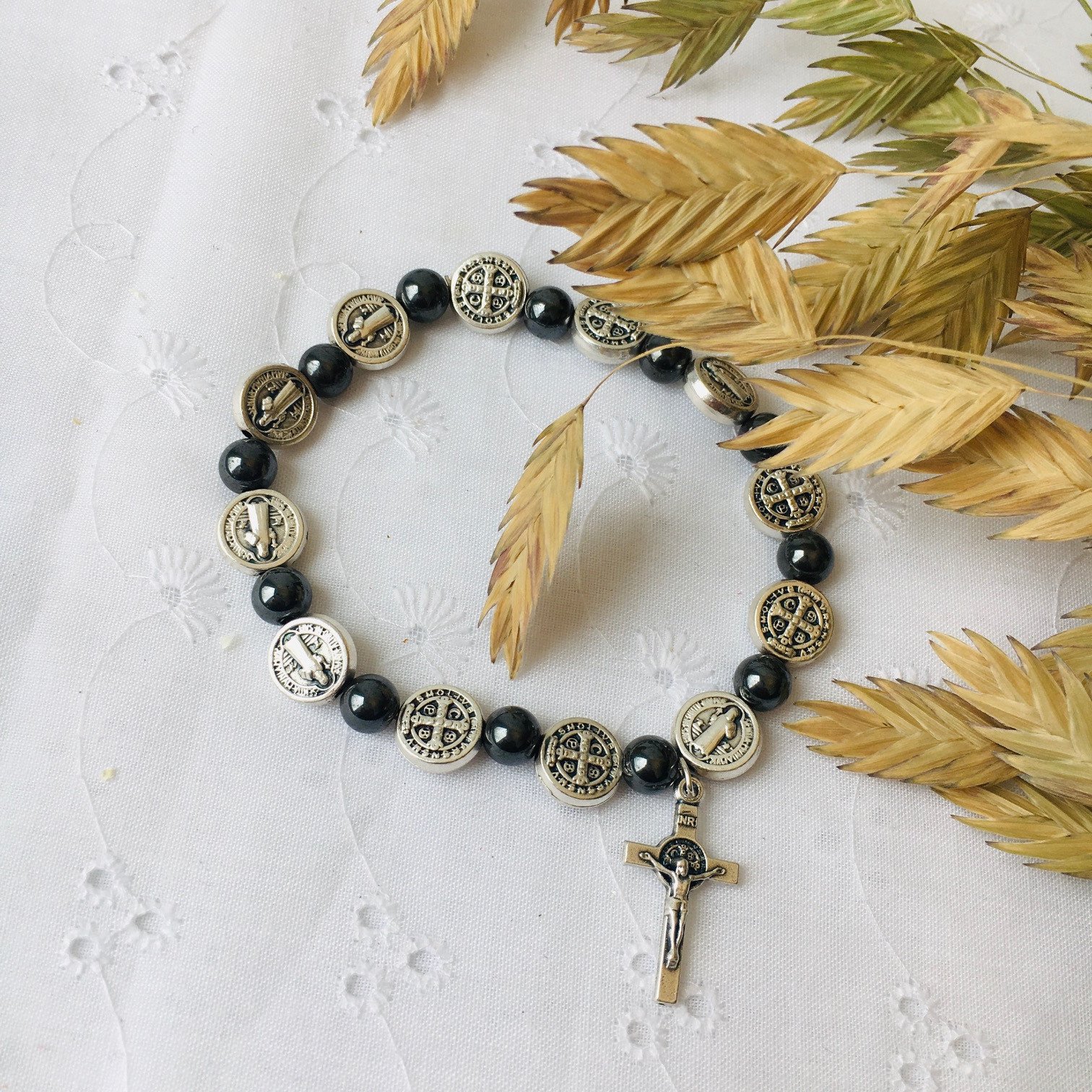 Très beau bracelet dédié à Saint Benoît, composé d'une alternance de perles en hématite véritable et de médailles frappées double-face de Saint Benoît en métal argenté et d'une croix de Saint Benoît, en métal argenté également.