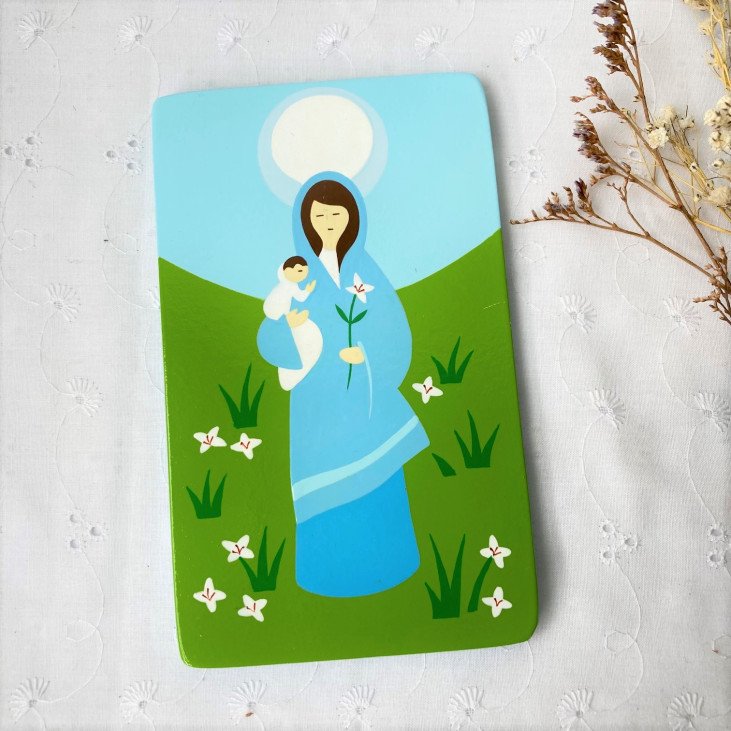 Ce ravissant cadre en bois pour enfant est peint et vernis à la main, il représente la Sainte Vierge Marie portant l'Enfant Jésus.