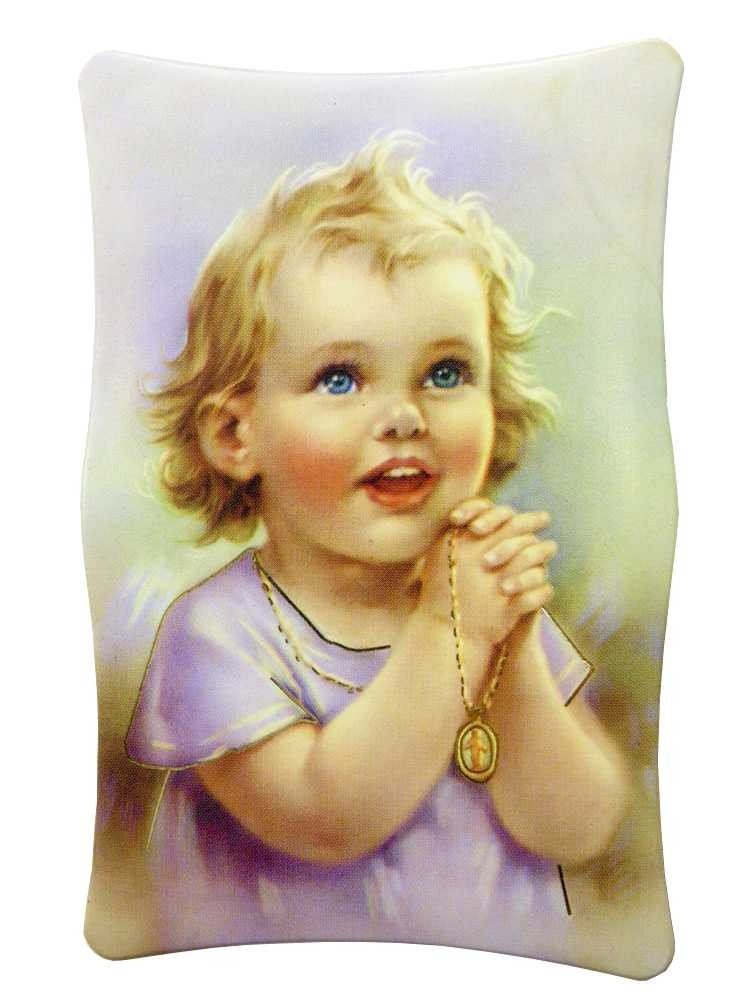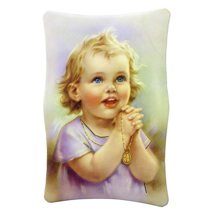 Cadre représentant un enfant en prière avec foi tenant dans ses mains une médaille.