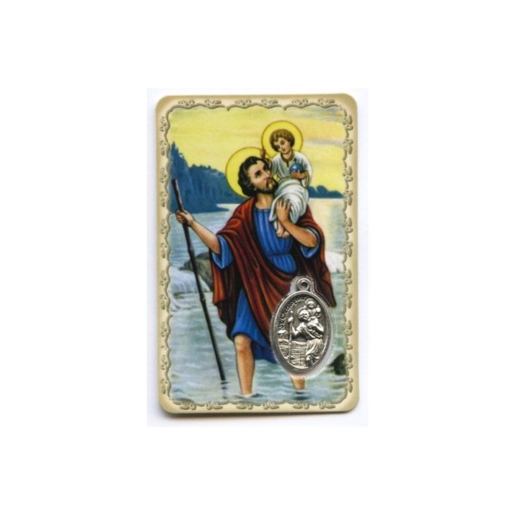La carte est plastifiée, ainsi elle ne craint ni la pluie ni les tâches : elle s'abîmera beaucoup moins vite. En ce qui concerne son aspect visuel, elle est imprimée en couleur. Au recto, vous pouvez observer l'image de Saint Christophe, le Saint patron des voyageurs. A cette image vient s'ajouter une médaille argentée de Saint Christophe. Au verso, comme sur toutes les cartes, vous pourrez lire la prière qui va avec l'image. Les dimensions de la carte de prière sont de 5,4 centimètres par 8,5 centimètres : grâce à sa petite taille, vous pourrez ainsi l'emmener partout avec vous. Cette carte sera parfaite dans votre portefeuille (elle est au format carte de crédit), dans votre voiture, ou partout ailleurs.