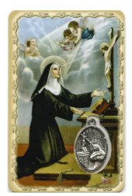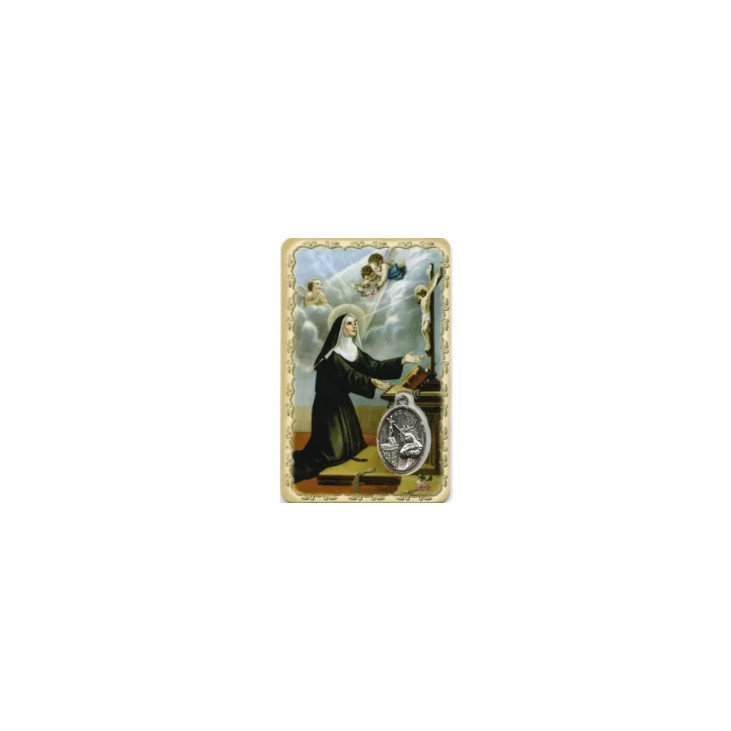 La carte est plastifiée, ainsi elle ne craint ni la pluie ni les tâches : elle s'abîmera beaucoup moins vite. En ce qui concerne son aspect visuel, elle est imprimée en couleur. Au recto, vous pouvez observer l'image de Sainte Rita, la Sainte patronne des causes désespérées. A cette image vient s'ajouter une médaille argentée de Sainte Rita. Au verso, comme sur toutes les cartes, vous pourrez lire la prière qui va avec l'image. Les dimensions de la carte de prière sont de 5,4 centimètres par 8,5 centimètres : grâce à sa petite taille, vous pourrez ainsi l'emmener partout avec vous. Cette carte sera parfaite dans votre portefeuille (elle est au format carte de crédit), dans votre voiture, ou partout ailleurs.