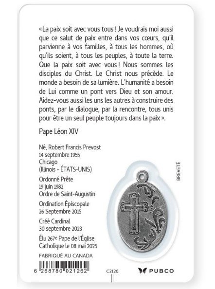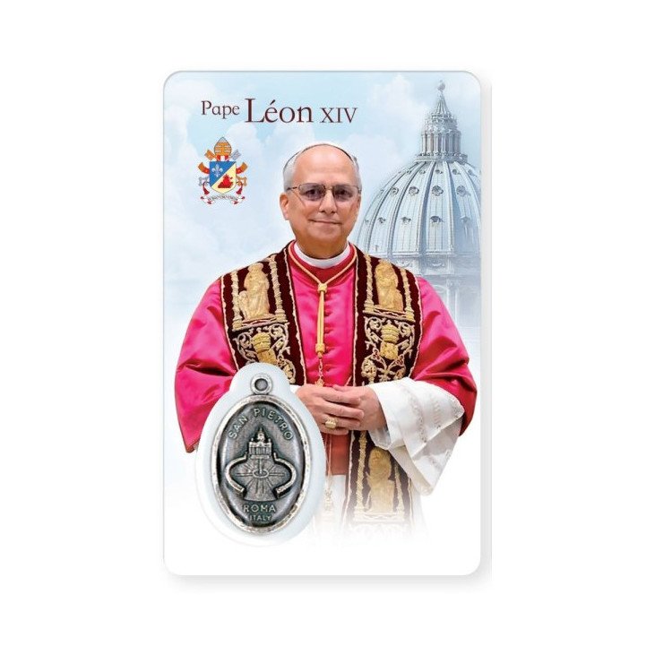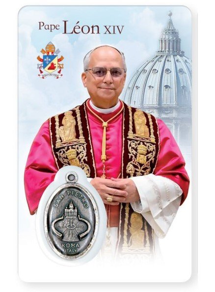 Adoptez et emportez partout avec vous cette petite carte de prière avec l'image de notre nouveau Pape Léon XIV, et une incrustation de la médaille du Vatican.