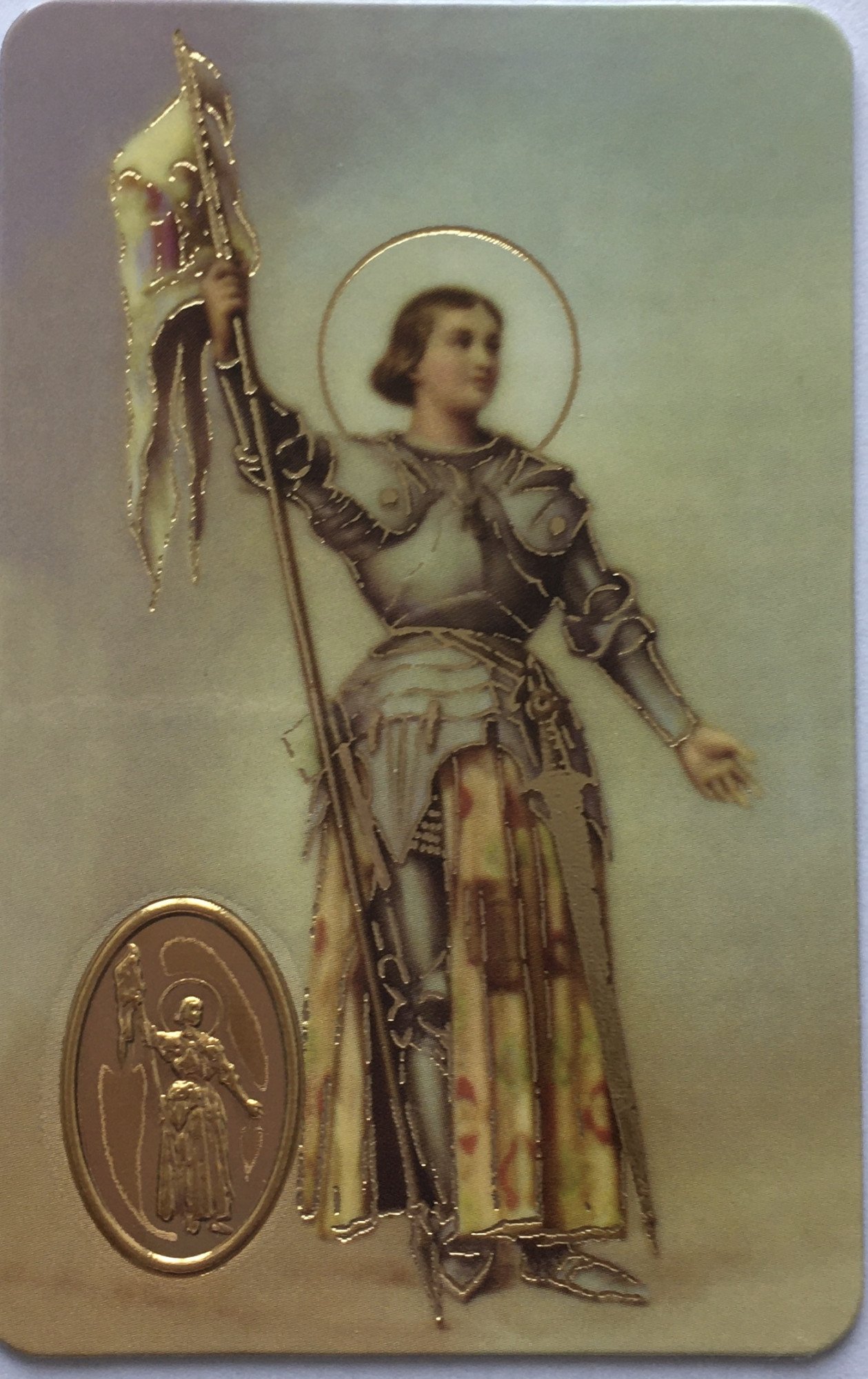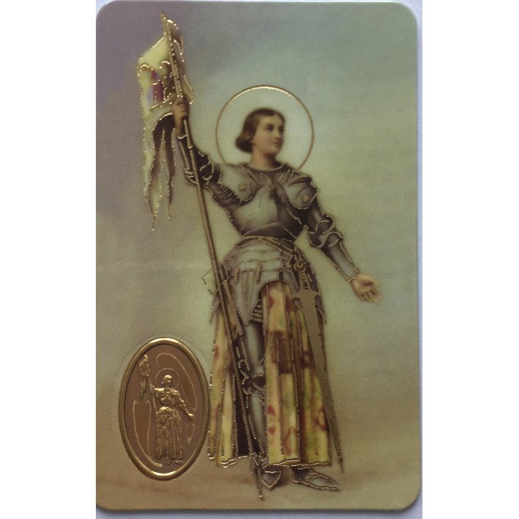 La carte est plastifiée, ainsi elle s'abîmera moins. En ce qui concerne son aspect visuel, elle est imprimée en couleur. Observez la douceur du dessin et de l'atmosphère qui s'en dégage. Au recto, vous pouvez observer l'image de Jeanne d'Arc. A cette image vient s'ajouter un poinçon doré, semblable à une médaille de Jeanne d'Arc. Au verso, comme sur toutes les cartes, vous pourrez lire la prière qui va avec l'image. Les dimensions de la carte de prière sont de 5,4 centimètres par 8,5 centimètres : grâce à sa petite taille, vous pourrez ainsi l'emmener partout avec vous. Cette carte sera parfaite dans votre portefeuille, dans votre voiture, ou partout ailleurs.