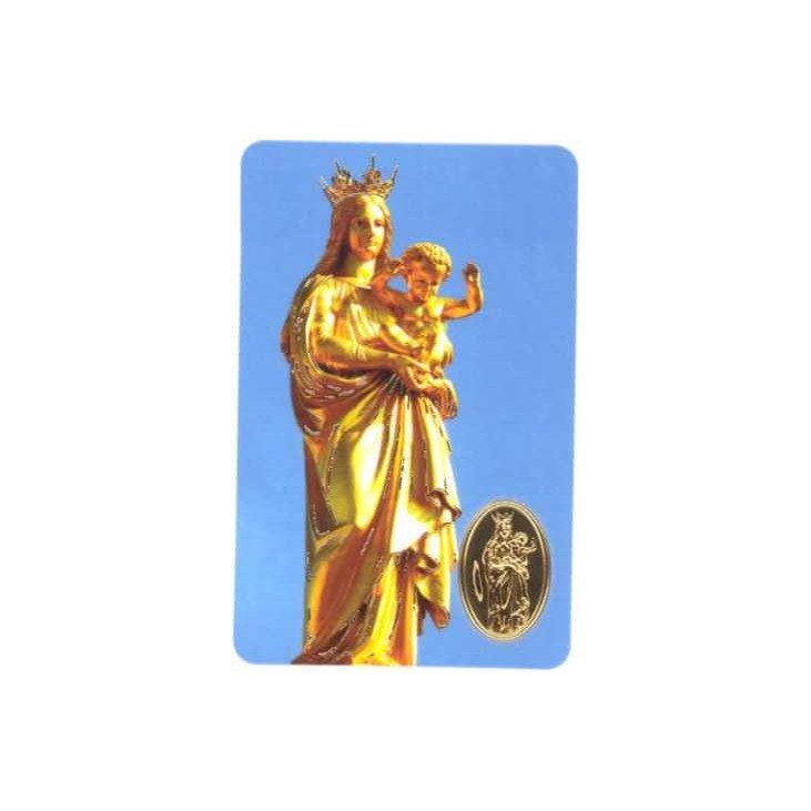 La carte est plastifiée, ainsi elle s'abîmera moins. En ce qui concerne son aspect visuel, elle est imprimée en couleur. Au recto, vous pouvez observer une statue de Notre-Dame de la Garde. A cette image vient s'ajouter un poinçon doré, semblable à une médaille de Notre-Dame de la Garde. Au verso, comme sur toutes les cartes, vous pourrez lire la prière qui va avec l'image.