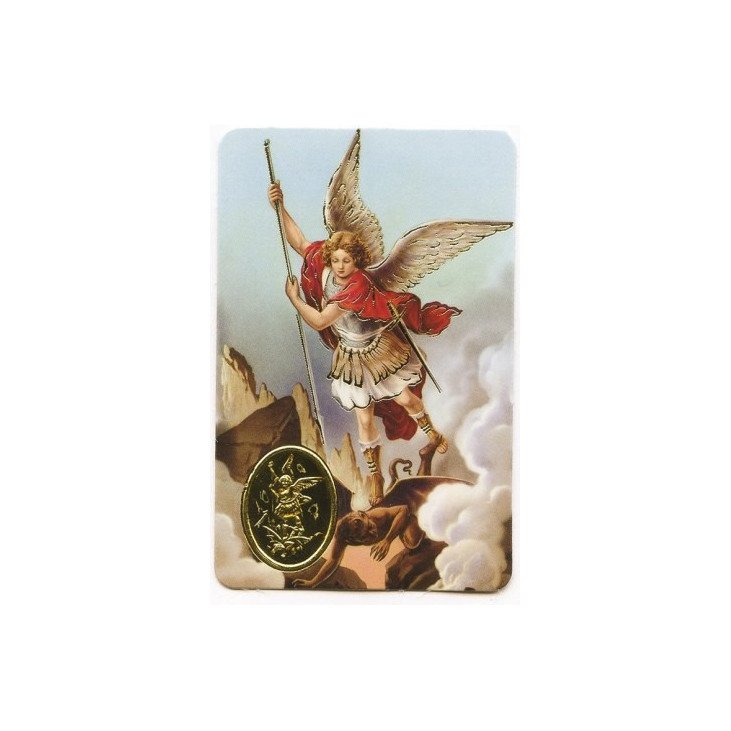 La carte est plastifiée, ainsi elle s'abîmera moins. En ce qui concerne son aspect visuel, elle est imprimée en couleur. Observez la douceur du dessin et de l'atmosphère qui s'en dégage. Au recto, vous pouvez observer l'image de Saint Michel, le chef de l'armée céleste de Dieu. A cette image vient s'ajouter un poinçon doré, semblable à une médaille de Saint Michel. Au verso, comme sur toutes les cartes, vous pourrez lire la prière qui va avec l'image. Les dimensions de la carte de prière sont de 5,4 centimètres par 8,5 centimètres: grâce à sa petite taille, vous pourrez ainsi l'emmener partout avec vous. Cette carte sera parfaite dans votre portefeuille, dans votre voiture, ou partout ailleurs.