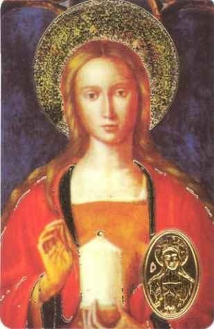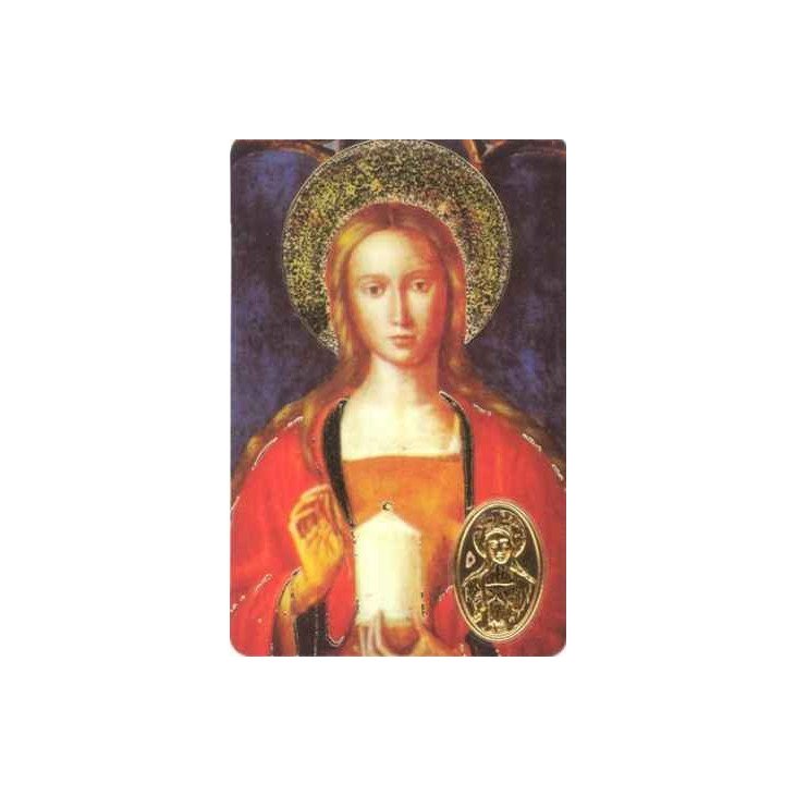 La carte est plastifiée, ainsi elle s'abîmera moins. En ce qui concerne son aspect visuel, elle est imprimée en couleur. Observez la douceur du dessin et de l'atmosphère qui s'en dégage. Au recto, vous pouvez observer le visage de Sainte Marie-Madeleine, qui tient dans sa main une bougie. A cette image vient s'ajouter un poinçon doré, semblable à une médaille dorée de sainte Marie-Madeleine. Au verso, comme sur toutes les cartes, vous pourrez lire la prière qui va avec l'image. Les dimensions de la carte de prière sont de 5,4 centimètres par 8,5 centimètres : grâce à sa petite taille, vous pourrez ainsi l'emmener partout avec vous. Cette carte sera parfaite dans votre portefeuille, dans votre voiture, ou partout ailleurs.
