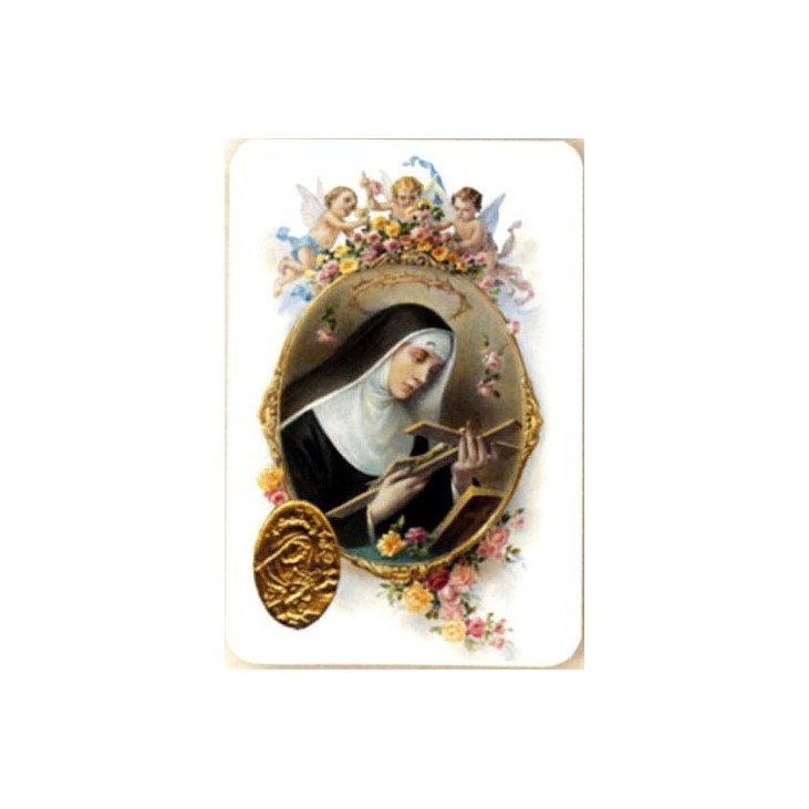 La carte est plastifiée, ainsi elle s'abîmera moins. En ce qui concerne son aspect visuel, elle est imprimée en couleur. Observez la douceur du dessin et de l'atmosphère qui s'en dégage. Au recto, vous pouvez observer l'image de Sainte Rita de Cascia tenant dans ses mains le crucifix et l'adorant de tout son cœur. A cette image vient s'ajouter un poinçon doré, semblable à une médaille dorée de Sainte Rita. Au verso, comme sur toutes les cartes, vous pourrez lire la prière qui va avec l'image. Les dimensions de la carte de prière sont de 5,4 centimètres par 8,5 centimètres: grâce à sa petite taille, vous pourrez ainsi l'emmener partout avec vous. Cette carte sera parfaite dans votre portefeuille (elle est au format carte de crédit), dans votre voiture, ou partout ailleurs.
