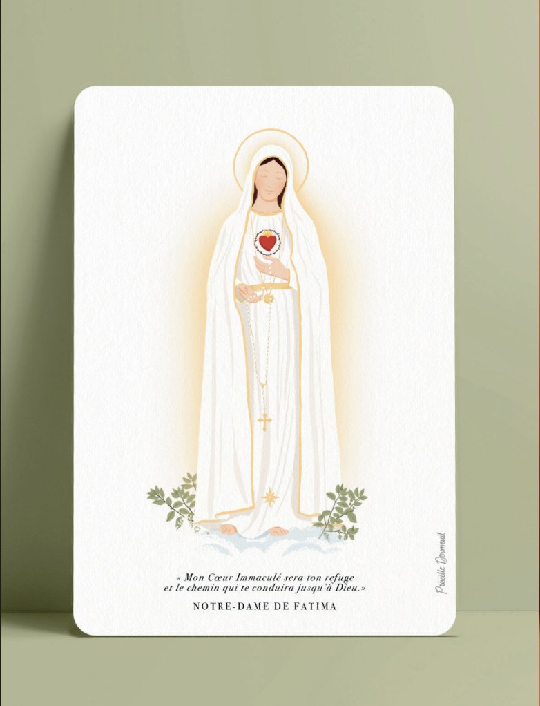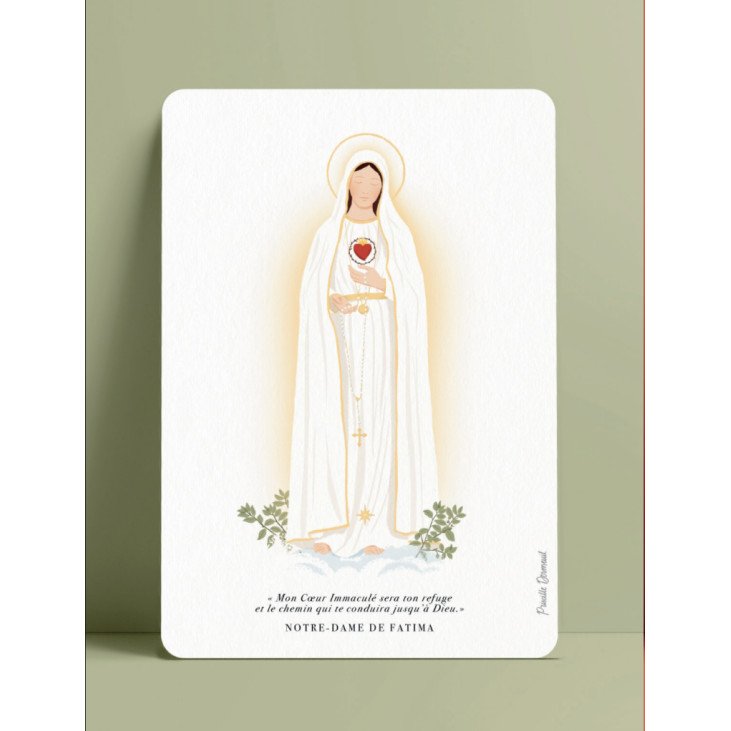 Découvrez cette superbe carte postale Notre-Dame de Fatima, appartenant à une collection unique consacrée aux apparitions de la Vierge Marie. Illustrée avec finesse par Priscille Dormeuil, illustratrice et designer graphique française, cette carte mariale met en lumière toute la beauté et la spiritualité de Fatima grâce à une aquarelle aux teintes douces et lumineuses. Sur chaque carte, une parole de la Vierge Marie et le nom de l’apparition sont imprimés. Pour ce modèle, la phrase « Mon Cœur Immaculé sera ton refuge, et le chemin qui te conduira jusqu’à Dieu » rappelle le message d’amour et de confiance que la Sainte Vierge a révélé aux trois enfants bergers lors des apparitions de 1917 au Portugal.