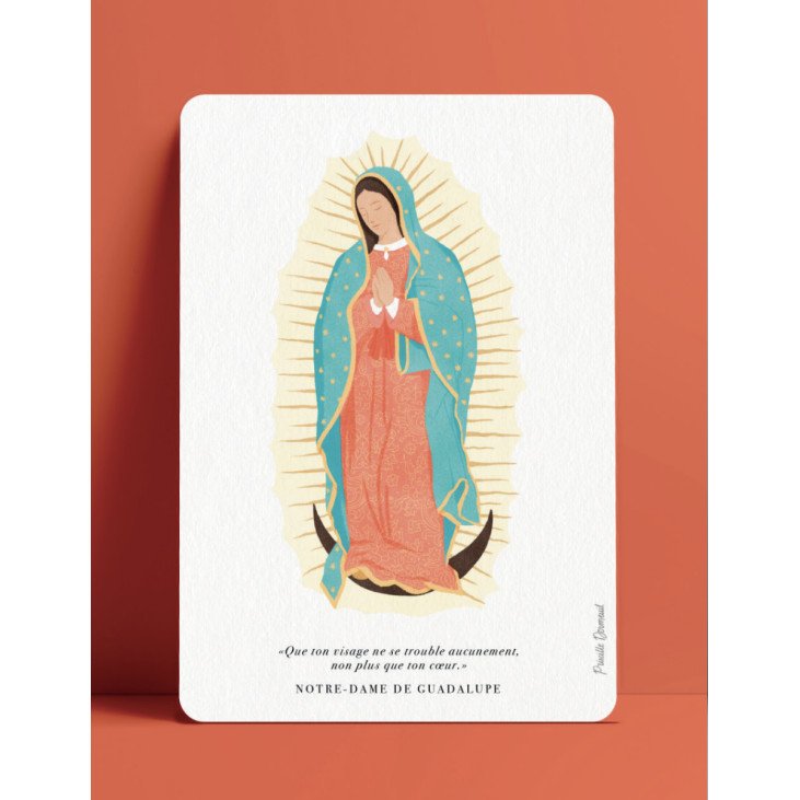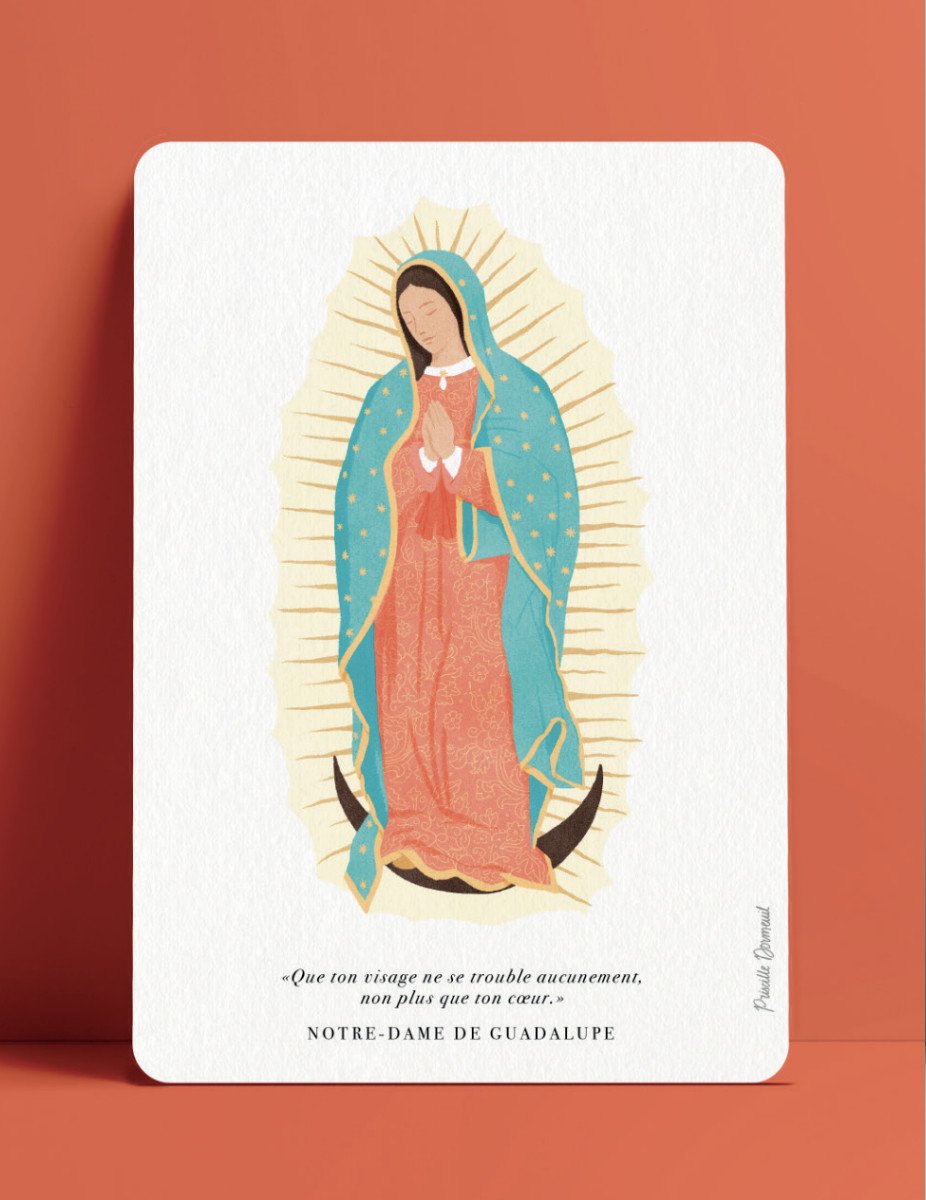 Offrez ou collectionnez la carte postale Apparitions de la Vierge Marie – Notre-Dame de Guadalupe, issue de la même série Apparitions mariales. Signée par l’illustratrice Priscille Dormeuil, cette illustration capte la grâce et la douceur de Marie telle qu’elle fut apparue à Juan Diego, le visage métis et entourée de symboles. La carte porte ce conseil maternel :