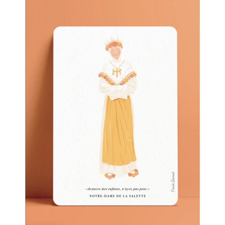 Cette carte postale rend hommage à l’apparition de la Vierge Marie à La Salette, survenue en 1846 dans les Alpes françaises. Imprimée sur un papier épais de qualité, elle présente une illustration douce et expressive réalisée dans un style aquarellé par la graphiste chrétienne Priscille Dormeuil. Le format 10x15 cm et les coins arrondis en font un support élégant, idéal pour accompagner une prière, une lettre, ou pour être conservé dans un missel.