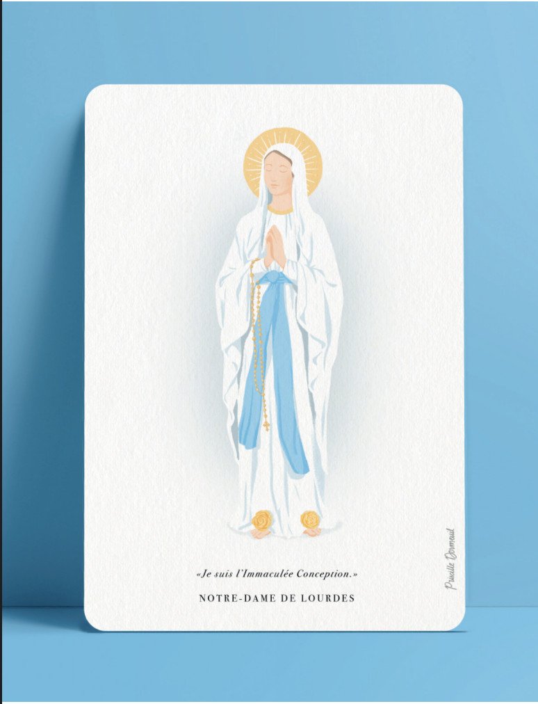 Découvrez cette magnifique carte postale Notre-Dame de Lourdes, issue d’une collection unique dédiée aux apparitions de la Vierge Marie. Illustrée avec talent par Priscille Dormeuil, illustratrice et designer graphique française, cette carte postale allie douceur et délicatesse à travers une aquarelle subtile aux couleurs douces et raffinées. Sur chaque carte, une phrase de la Vierge Marie est imprimée ainsi que le nom de l'apparition représentée. Ici "Je suis l'Immaculée Conception" est la parole que la Sainte Vierge a révélé à Bernadette Soubirous à Lourdes.