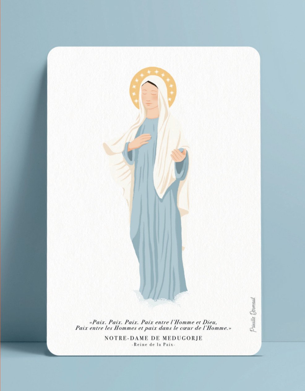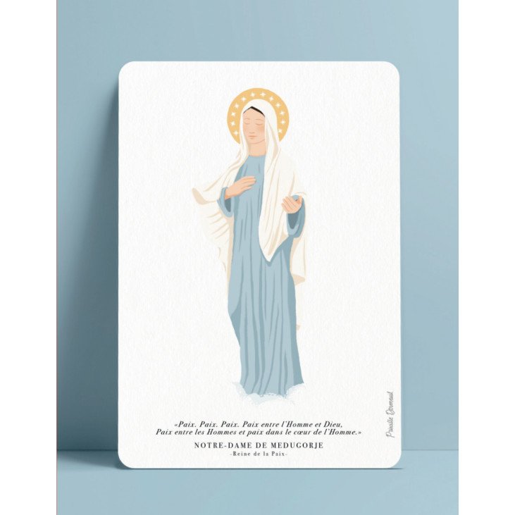 Notre-Dame y est invoquée sous le nom de "Reine de la Paix", et ses messages insistent sur la prière du rosaire, la confession, l’eucharistie et la lecture de la Parole de Dieu. Cette carte est une invitation à accueillir, dans le silence de son cœur, cet appel maternel à la paix et à la foi.