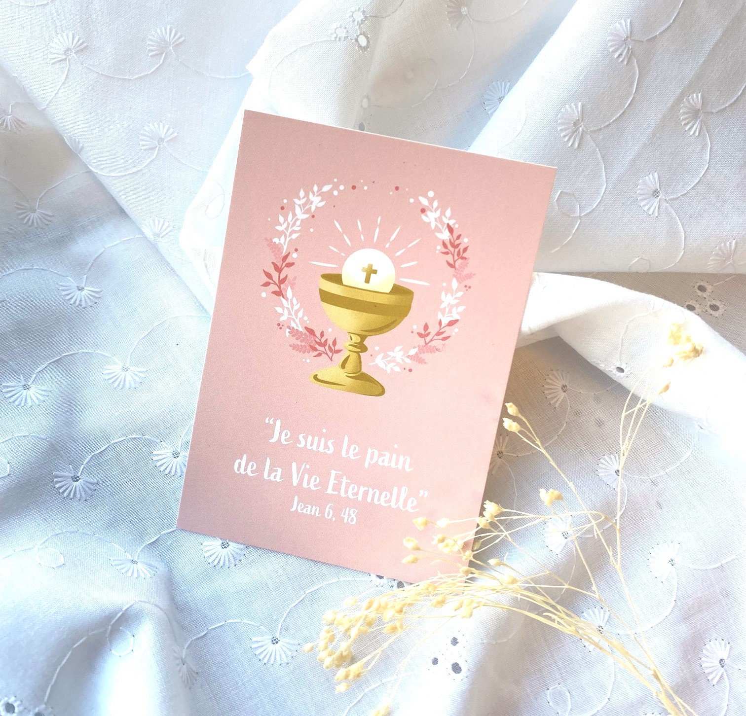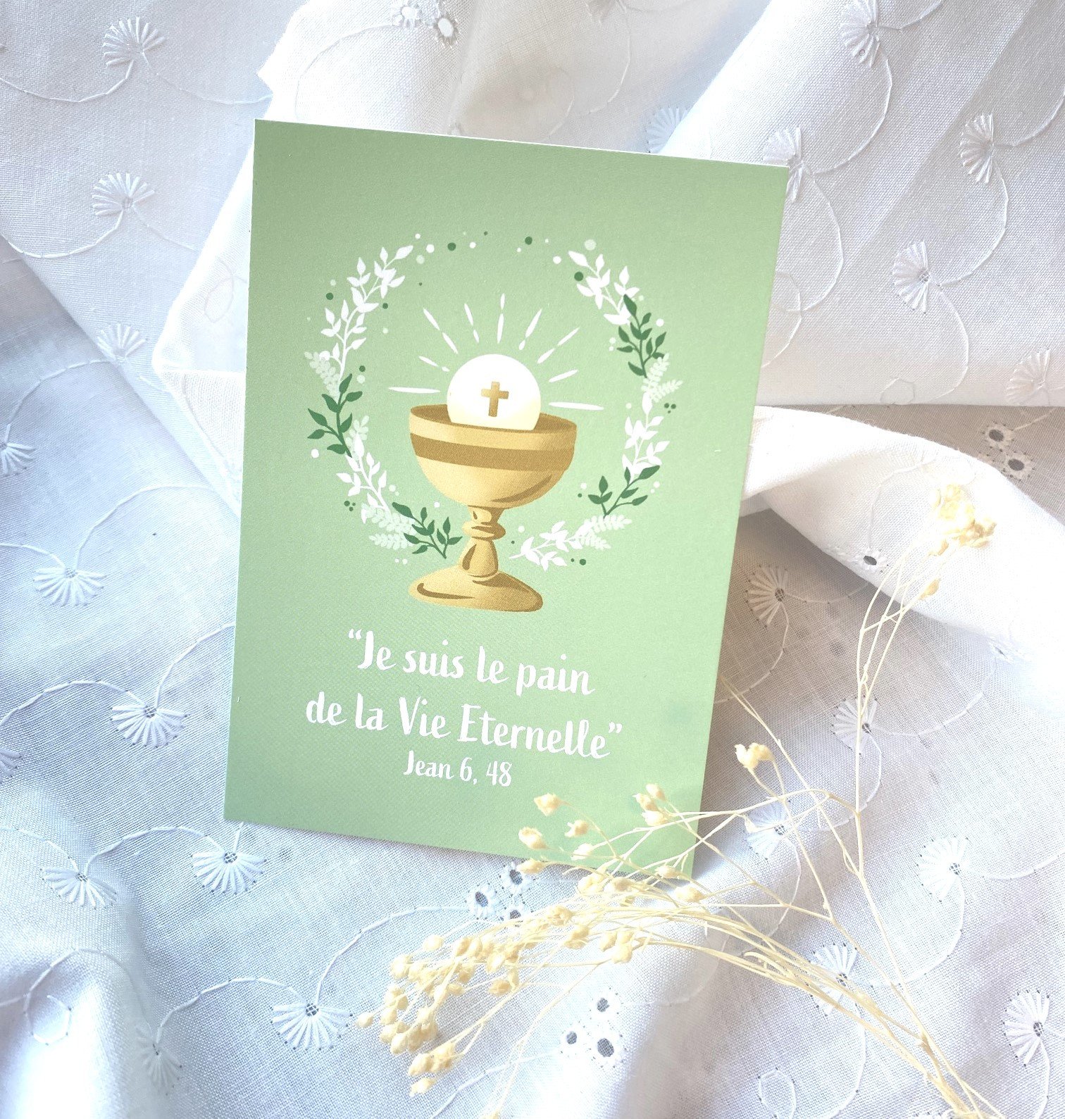 Pour garder un beau souvenir de cette cérémonie, optez pour les jolies Cartes de Première Communion - Je suis le pain de la Vie Eternelle, avec dos personnalisable.