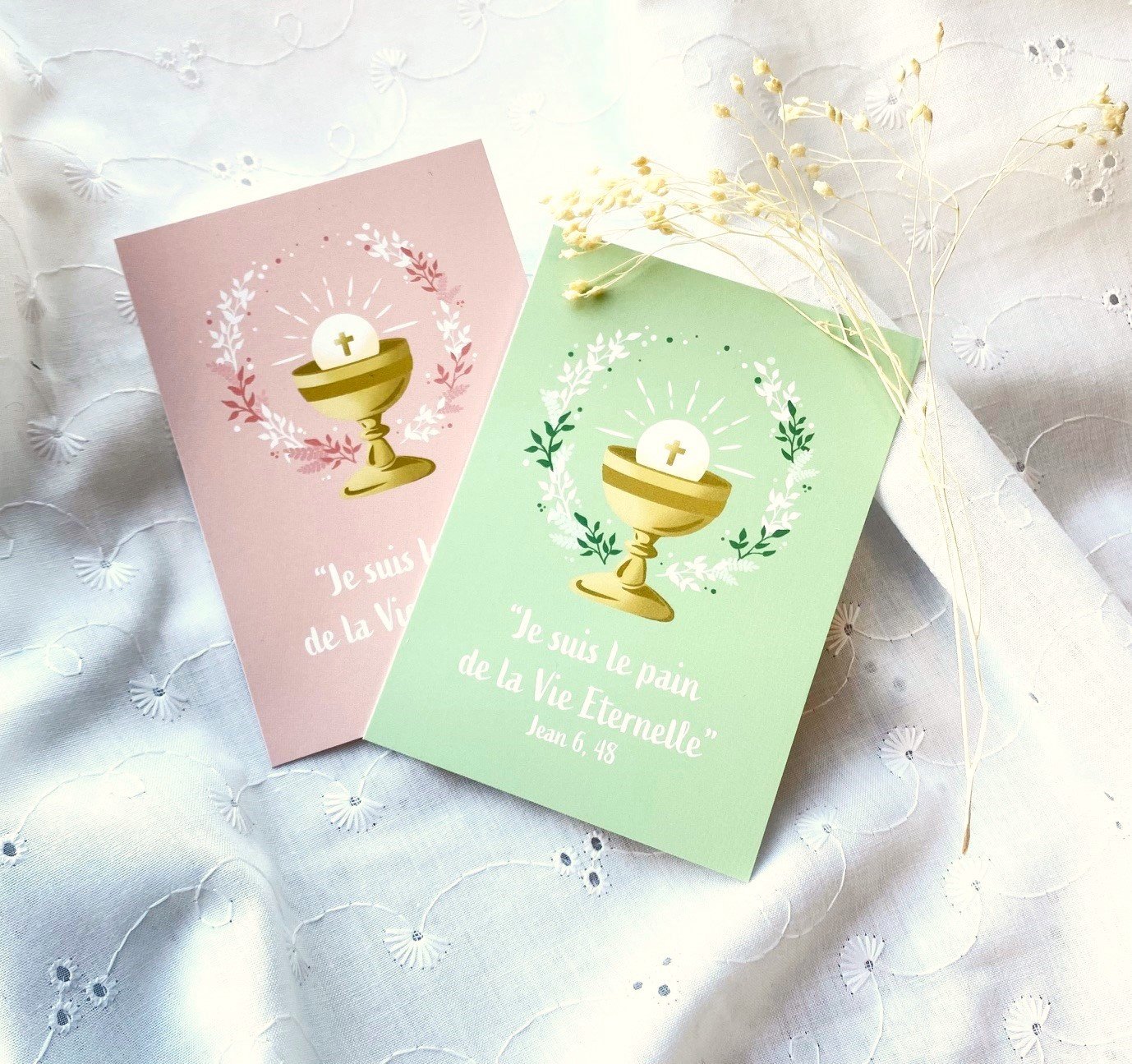 Ces cartes de Première Communion, créées exclusivement pour la Boutique Sainte Marie, sont une belle manière de garder un souvenir précieux de ce jour de grâce. Délicatement illustrées par une jeune graphiste rouennaise, elles mettent en lumière le calice et l’hostie consacrée, rappelant les paroles du Christ :
