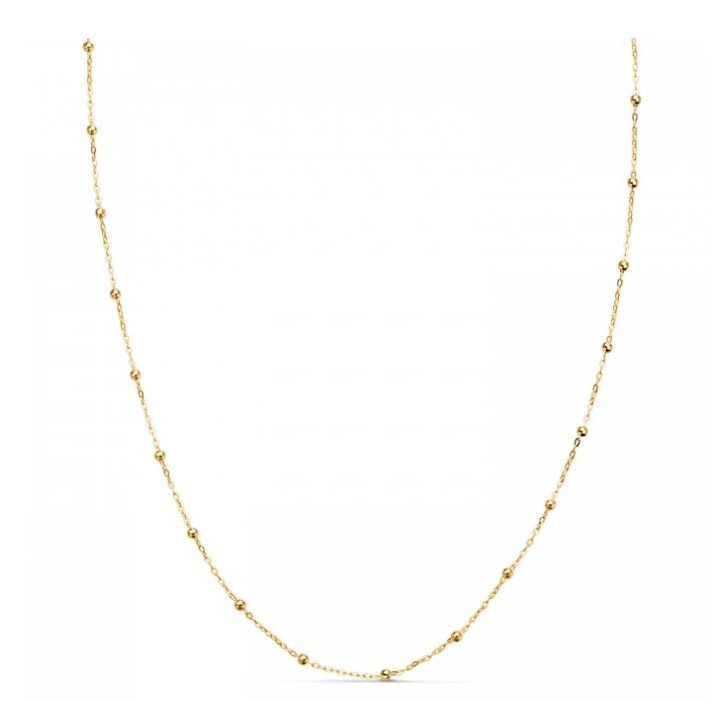 Délicate et raffinée, cette chaîne en or 18 carats est composée de petites boules en or de 1.8 mm de diamètre, montées sur une fine chaîne maille forçat de 0.5 mm d'épaisseur. Les petits grains sont espacés de 2 cm les uns des autres.