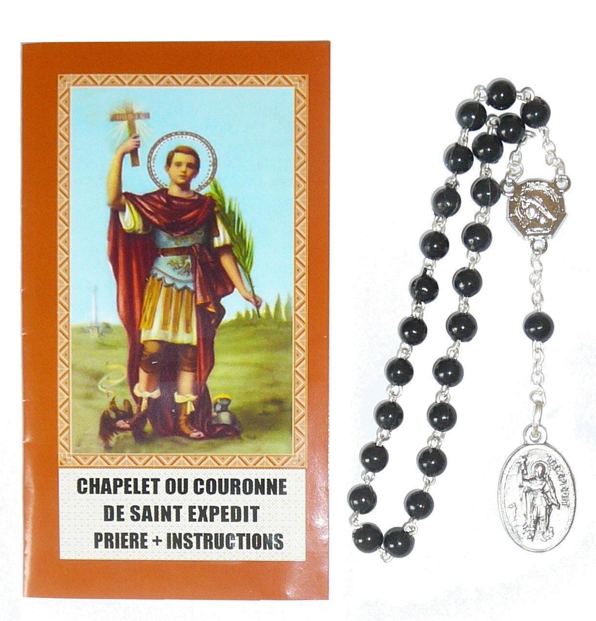 Chapelet ou couronne de Saint Expedit, en résine noire monté sur chaîne indécrochable en aluminium. Ce chapelet se prie en récitant la prière de Saint Expédit (fournie sur la notice) à chacun des 20 grains qui le composent. Le chapelet de Saint Expedit possède également une médaille de la Vierge Marie au coeur, et une médaille de Saint Expédit ovale, sur laquelle on récite une oraison spéciale.