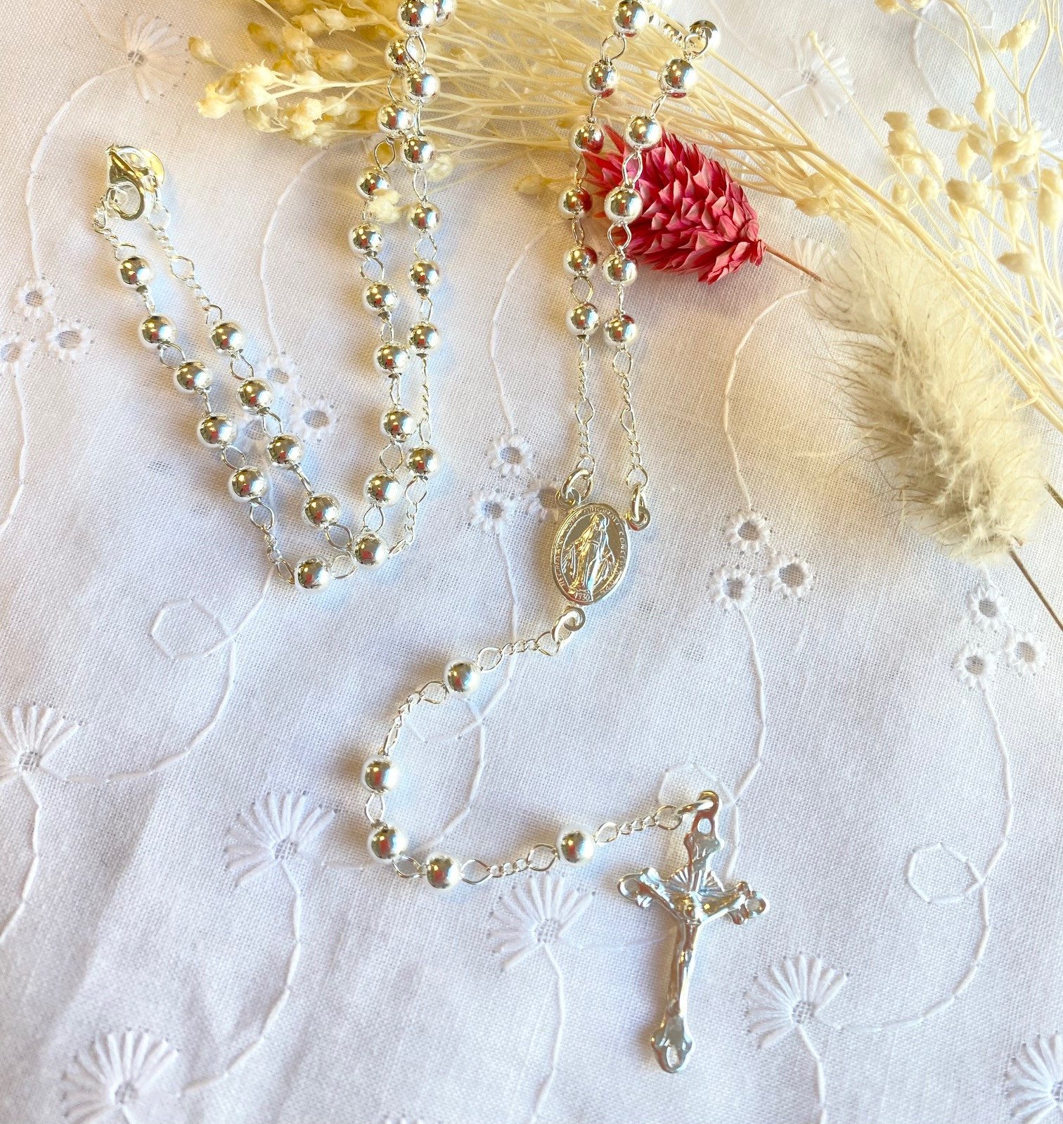 L’argent, métal noble et durable, évoque la pureté et l’éclat de la foi. C’est un matériau souvent choisi pour les objets religieux, car il traverse le temps sans perdre sa lumière, à l’image de la Parole de Dieu. Chaque grain invite à réciter un "Je vous salue Marie", chaque dizaine à méditer un mystère du Rosaire, dans la paix du cœur.