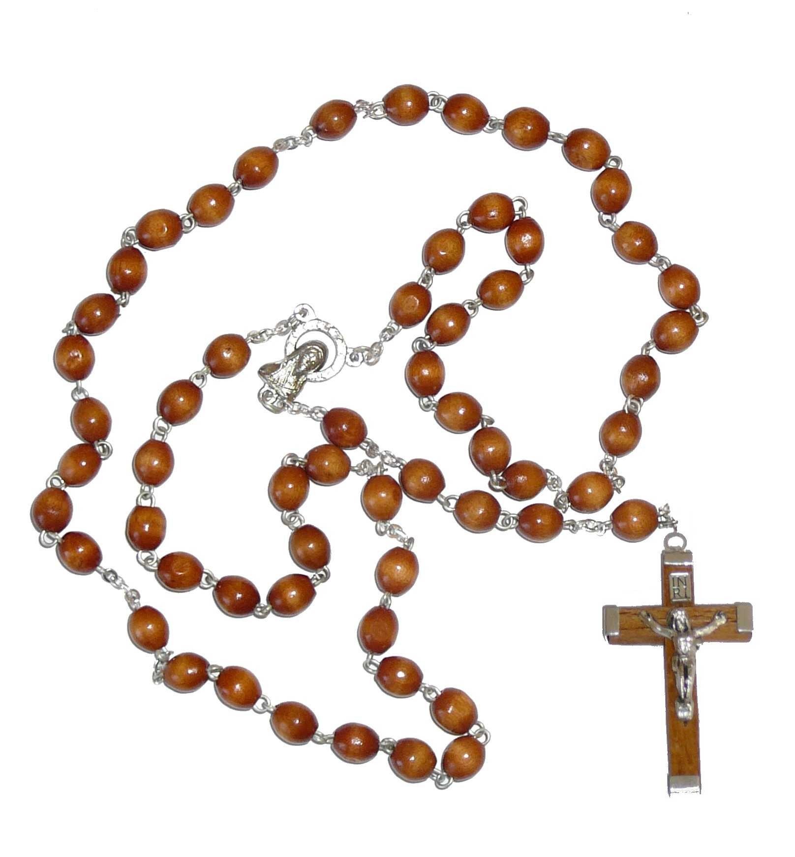 Très beau chapelet monté sur une chaîne argentée, composé de grains de 7 mm de diamètre, en bois, ainsi que d'une médaille ajourée de la Vierge Marie. Vous pourrez également retrouver au dos de cette médaille, le Sacré Coeur de Jésus.