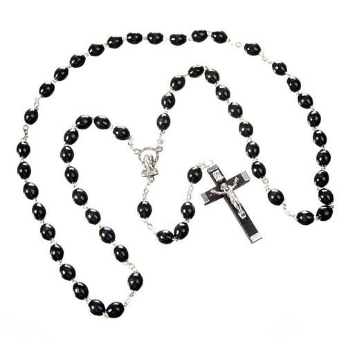 Très beau chapelet classique monté sur une chaîne argentée, composé de grains légèrement ovales de 7 mm de diamètre en bois noir, ainsi que d'une médaille ajourée de la Vierge Marie. Vous pourrez également retrouver au dos de cette médaille, le Sacré Coeur de Jésus.
