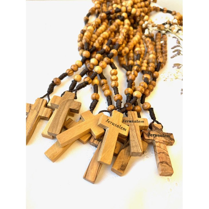 Très beau chapelet de Jérusalem en bois d'olivier, monté sur corde, d'une taille de 35 cm.