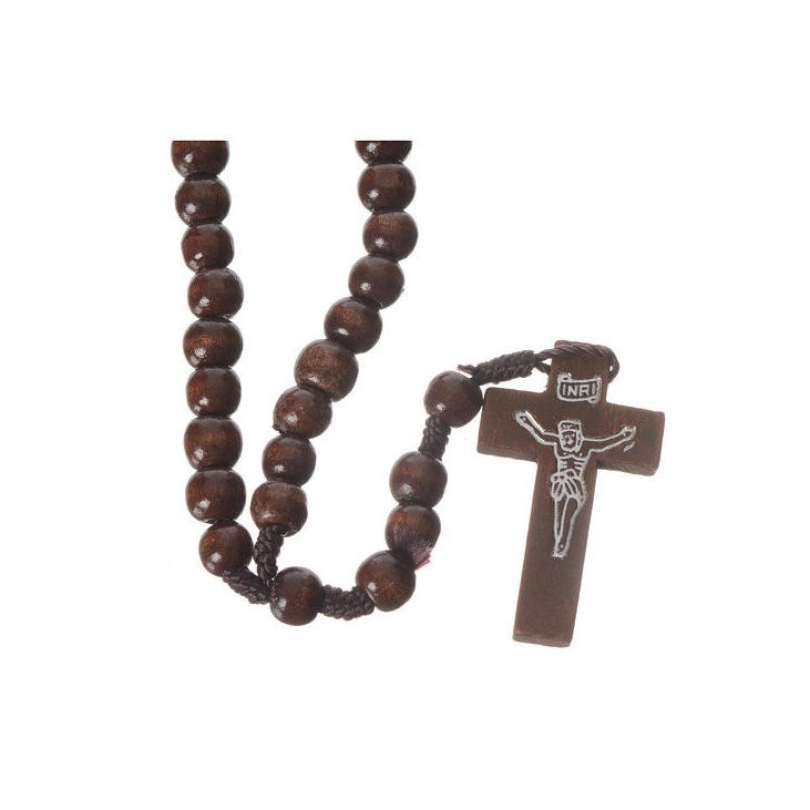 Ce chapelet en bois est monté sur corde, il est composé de grains en bois marron foncé, d'un diamètre de 8 mm.