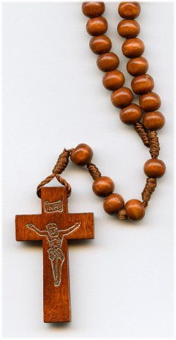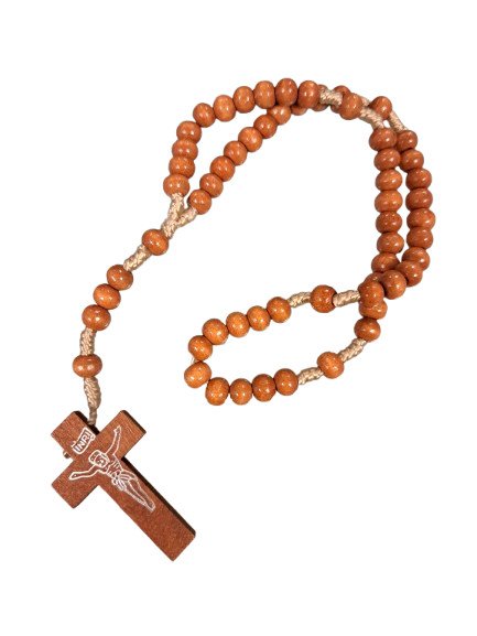 Ce chapelet est monté sur corde et il est composé de grains ronds en bois marron clair d'un diamètre de 6 mm. La croix est gravée en argenté à l'effigie du Christ en croix.