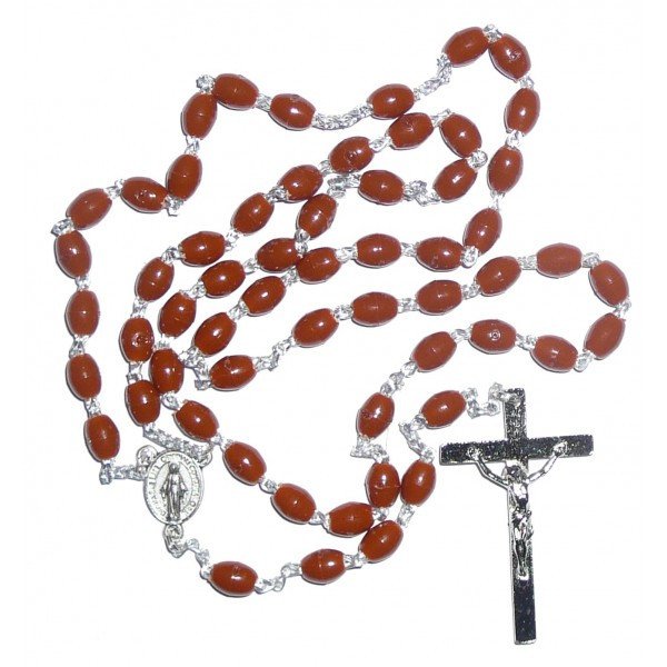Chapelet composé de perles marron ovales, en plastique, d'une longueur de 7 mm, d'une médaille miraculeuse et de la croix du Christ.