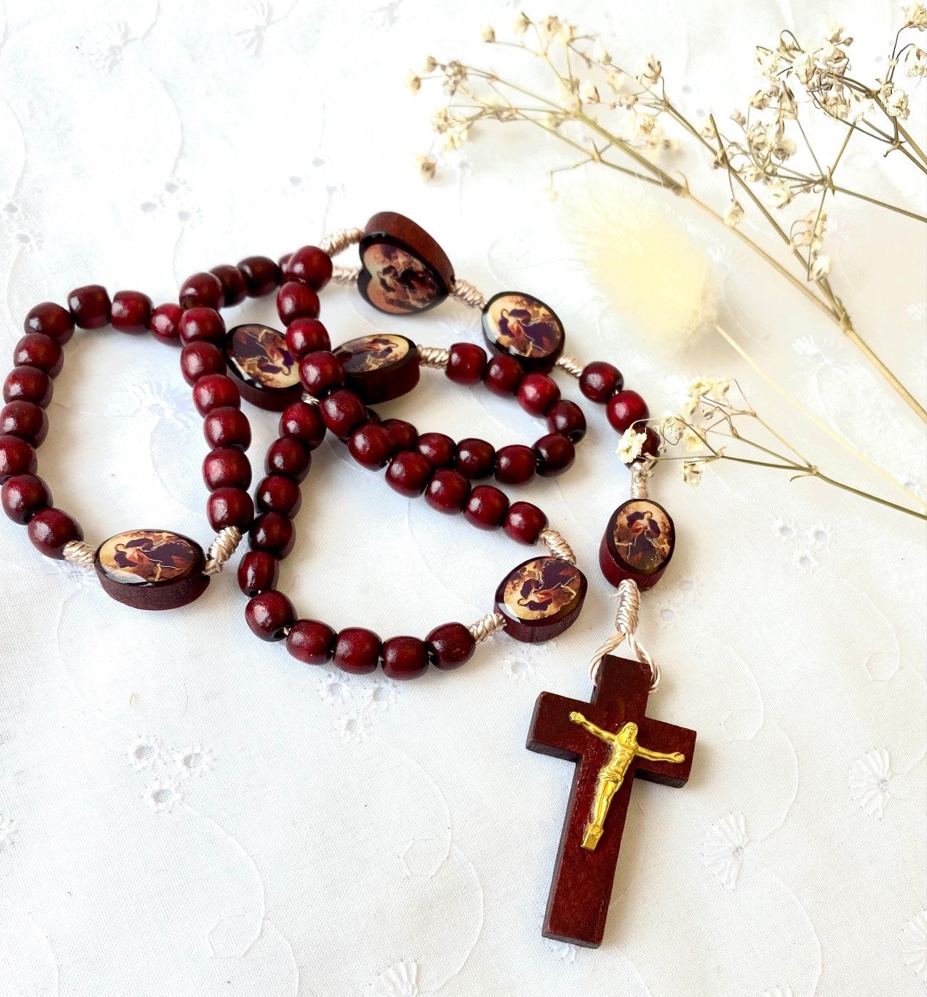 Ce chapelet est monté sur une corde beige, il est composé de grains en bois de 7 mm de diamètre, de couleur bordeaux foncée, de perles en bois au coeur et entre chaque dizaine représentant Marie qui défait les noeuds, d'une croix en bois de 4 cm avec Christ en métal.