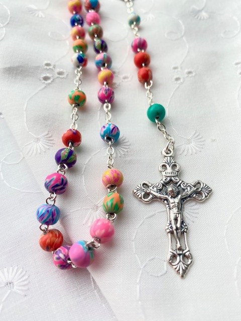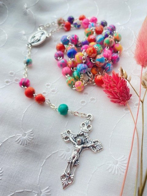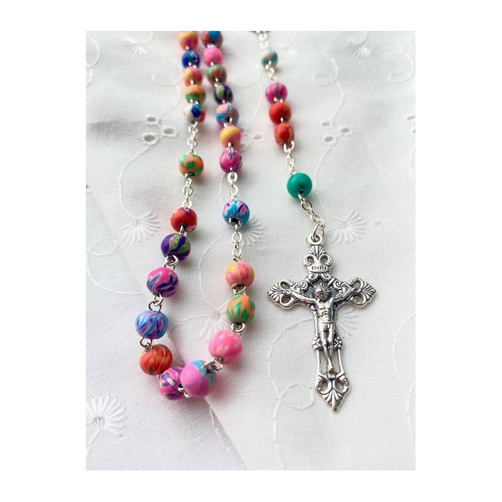Chaque perle de ce chapelet semble être une fête ! Le choix des couleurs vives, réparties avec harmonie, rend l’objet à la fois attrayant et accessible, notamment pour les enfants ou les jeunes découvrant la prière du chapelet. La matière Fimo, douce au toucher et résistante, apporte une touche contemporaine sans altérer la solennité du Rosaire.