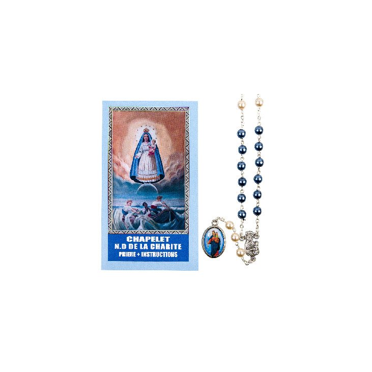 Très beau chapelet avec des grains ronds bleus et une médaille en résine couleur de Notre-Dame de la Charité.