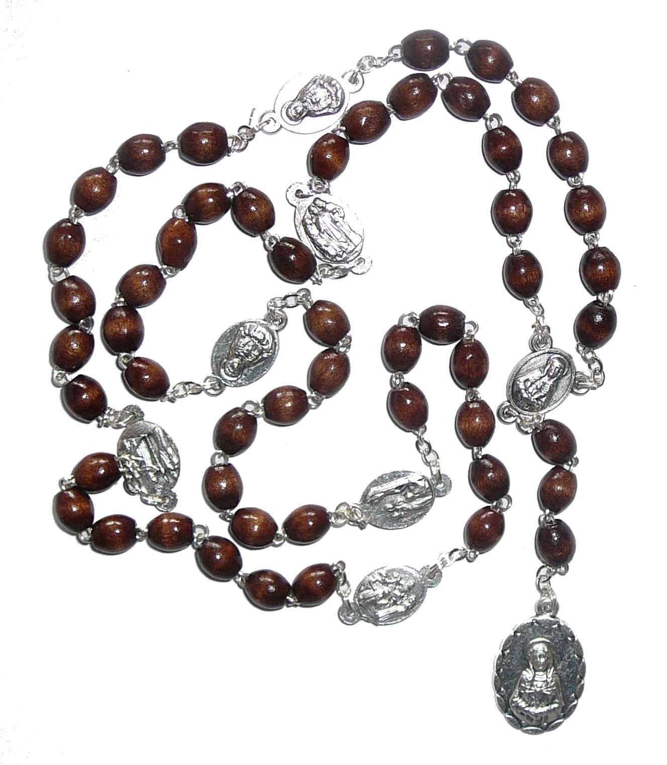 Ce chapelet des 7 douleurs de Marie est en bois noir ou marron monté sur chaîne.