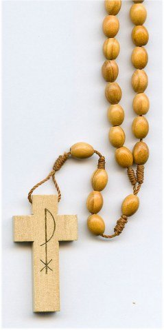 Très joli chapelet de pèlerin monté sur corde, composé de grains ovales en bois d'olivier marron clair, d'une longueur de 9 mm. Il sera le parfait cadeau pour un enfant ou un jeune lors de sa première communion, de sa profession de foi ou de sa confirmation.