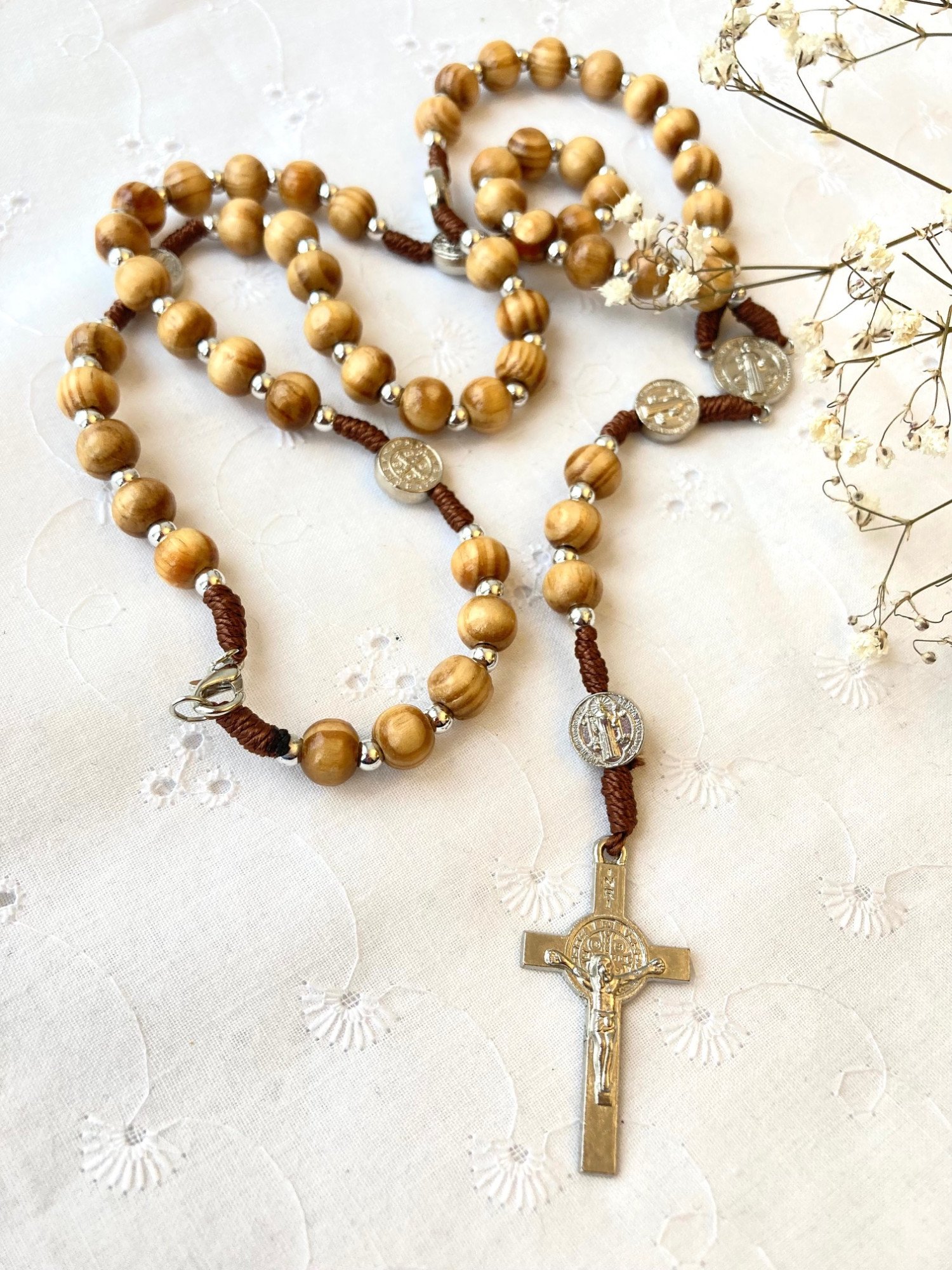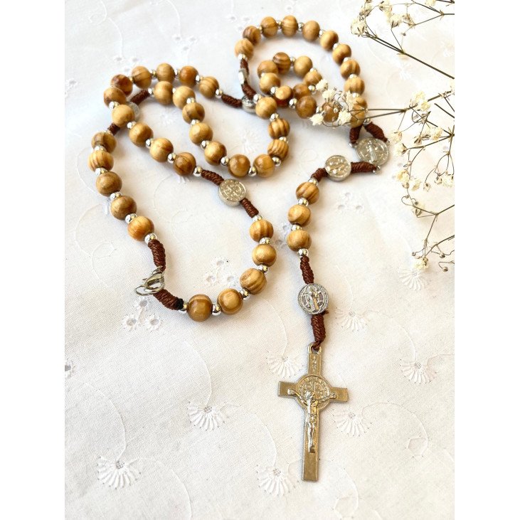 Très beau chapelet sur corde à l'effigie de Saint Benoît, composé de grains en bois d'olivier de 7 mm de diamètre, séparés par de petites perles fines argentées.