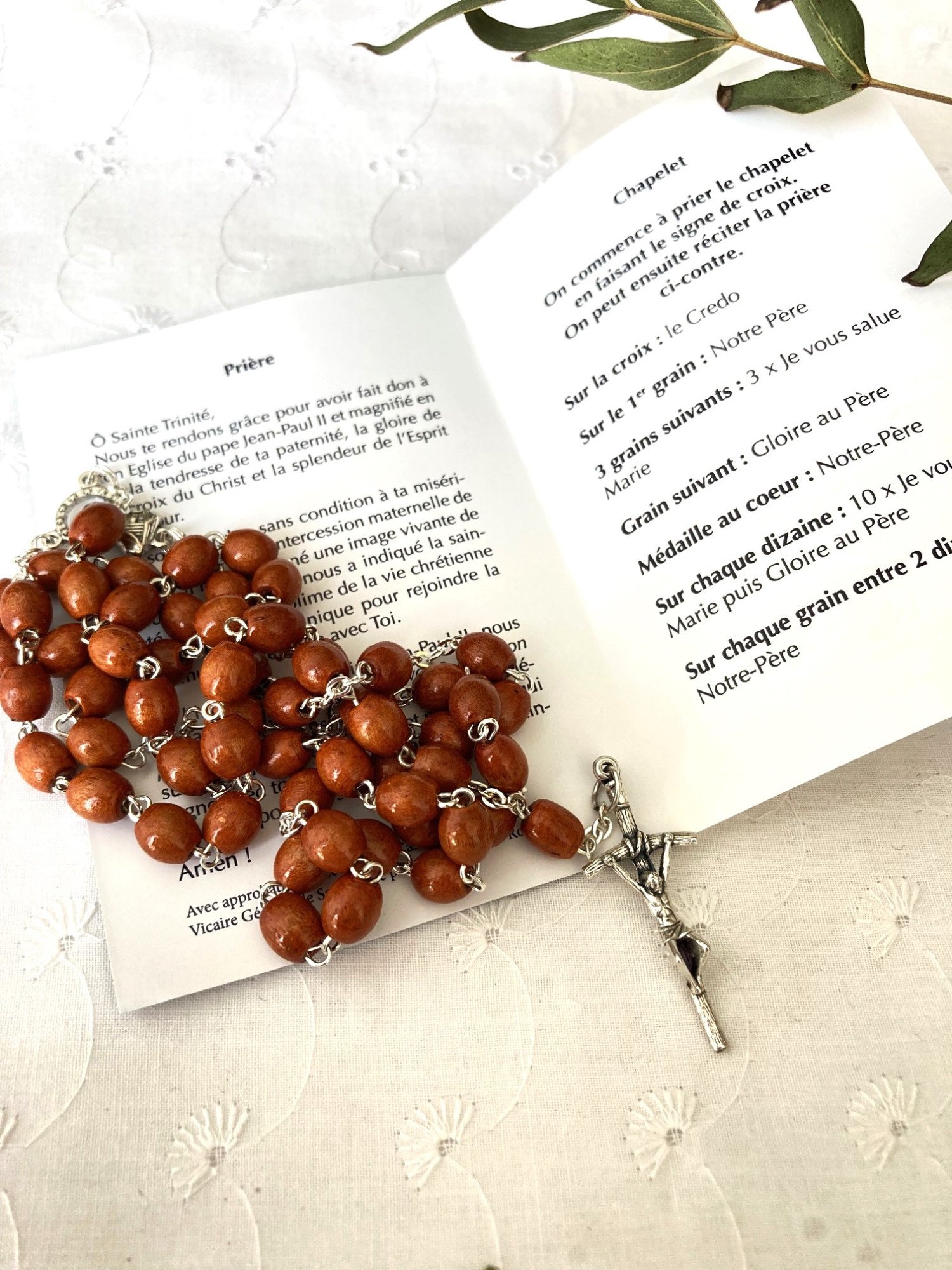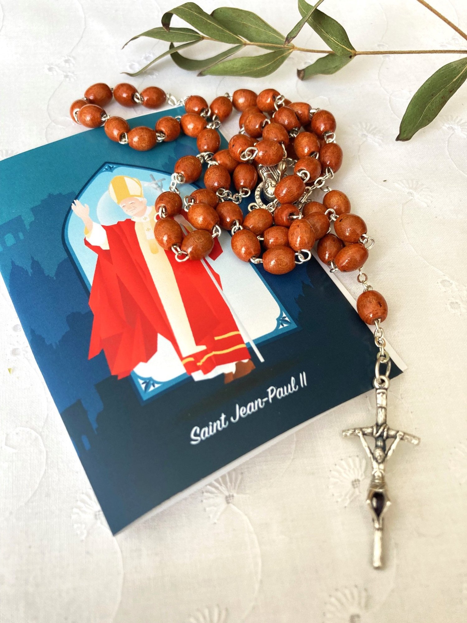 Le chapelet Saint Jean-Paul II est en bois clair monté sur chaîne, avec la croix de saint Jean-Paul II. Il est livré dans sa pochette plastique avec la notice. Sur chaque notice, retrouvez une prière d'introduction et l'explication du chapelet.