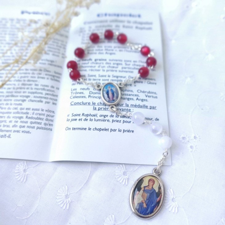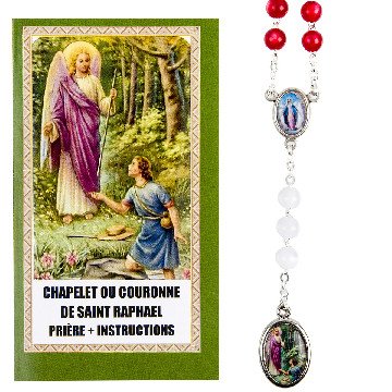 Ce court chapelet, également appelé couronne de Saint Raphaël, est composé de neuf grains en résine rouge et trois grains blancs. Il est monté sur chaîne argentée et est agrémenté d'une médaille de 16 mm en résine couleur représentant la Vierge Miraculeuse et d'une médaille de 22 mm en résine couleur représentant l'Archange Raphaël, le saint guérisseur.