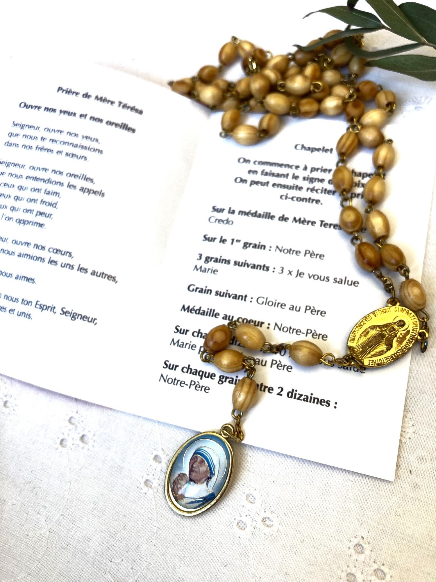 Le chapelet Sainte Mère Teresa est en bois clair monté sur chaîne dorée, avec une médaille de la Vierge miraculeuse en métal doré vieilli, et une médaille de sainte Mère Teresa en résine colorée. Il est livré dans sa pochette plastique avec la notice. Sur chaque notice, retrouvez une prière d'introduction et l'explication du chapelet.