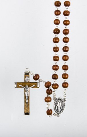 Ce chapelet dispose d'une croix du Christ en bois ainsi que d'une médaille de la Vierge Marie en métal argenté.