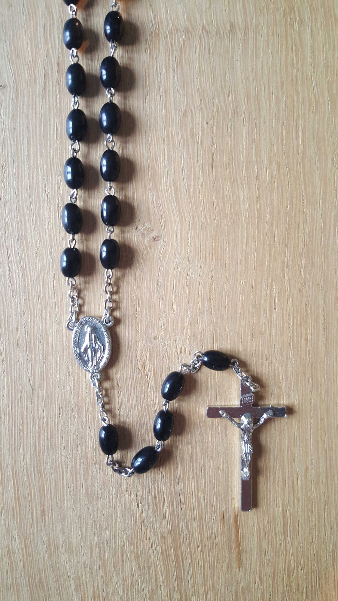 Chapelet composé de perles ovales noires d'une longueur de 7 mm, d'une médaille de la Vierge Miraculeuse en métal et d'une croix du Christ, en métal également.