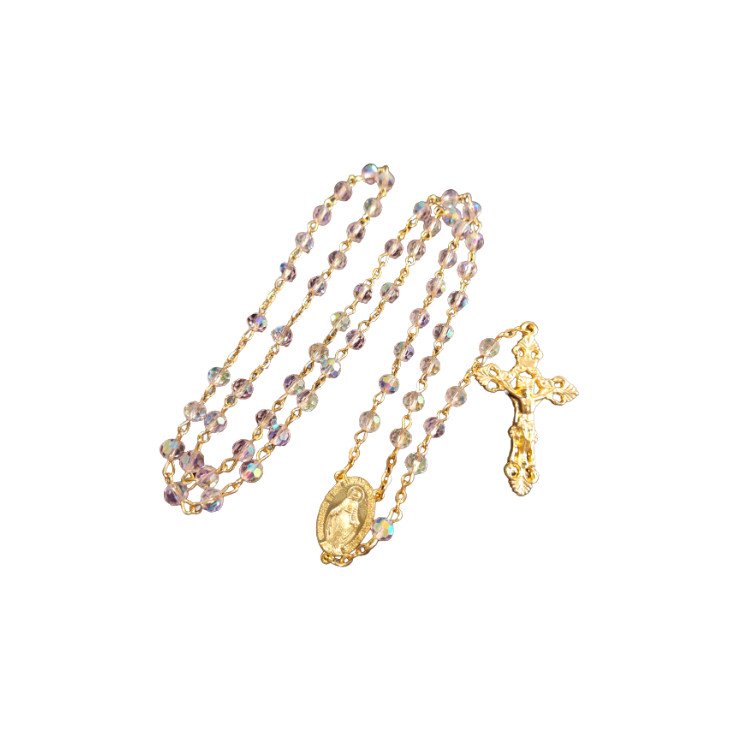Offrez-vous ou offrez à vos proches ce très beau chapelet cristal rose de la Vierge Miraculeuse, monté sur une chaine dorée, composé de délicates perles cristal roses à facettes.