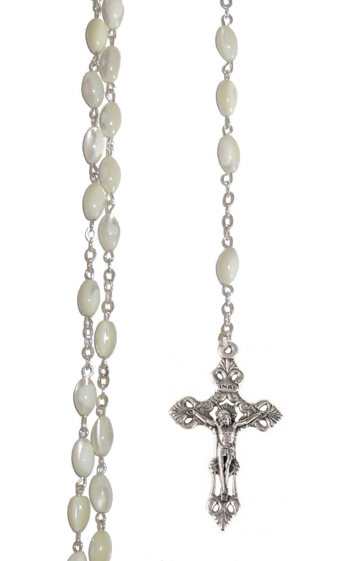 Adoptez ce très beau chapelet Vierge Miraculeuse en nacre, monté sur chaîne argentée ! Il est composé de perles ovales dites grain de riz, en nacre véritable, d'une longueur de 7 mm, ainsi que d'une très belle médaille de la Vierge Miraculeuse. Il se termine par une jolie croix travaillée en métal argenté.