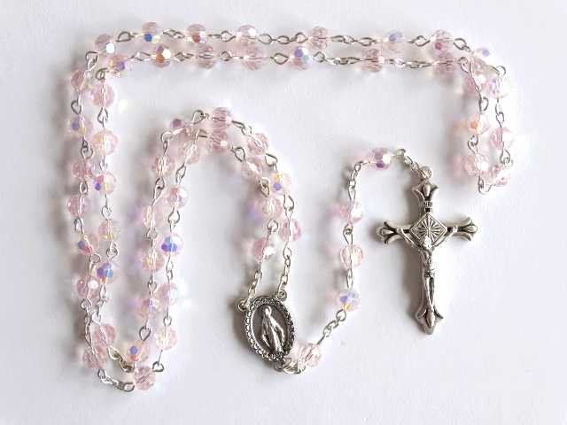 Très beau chapelet cristal de couleur rose, monté sur chaîne argentée.