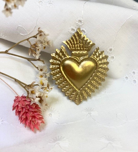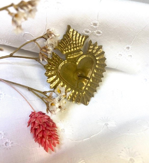 Clou décoratif de bougie reprenant le motif de l'Ex-Voto Coeur brûlant, en fer et laiton doré.
