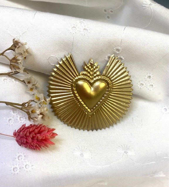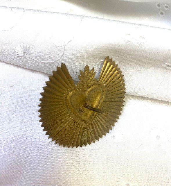 Voici un très joli bijoux de bougie en laiton doré reprenant le motif traditionnel des Ex-Voto : un coeur brûlant, rayonnant, Coeur de Jésus, Coeur Glorieux.