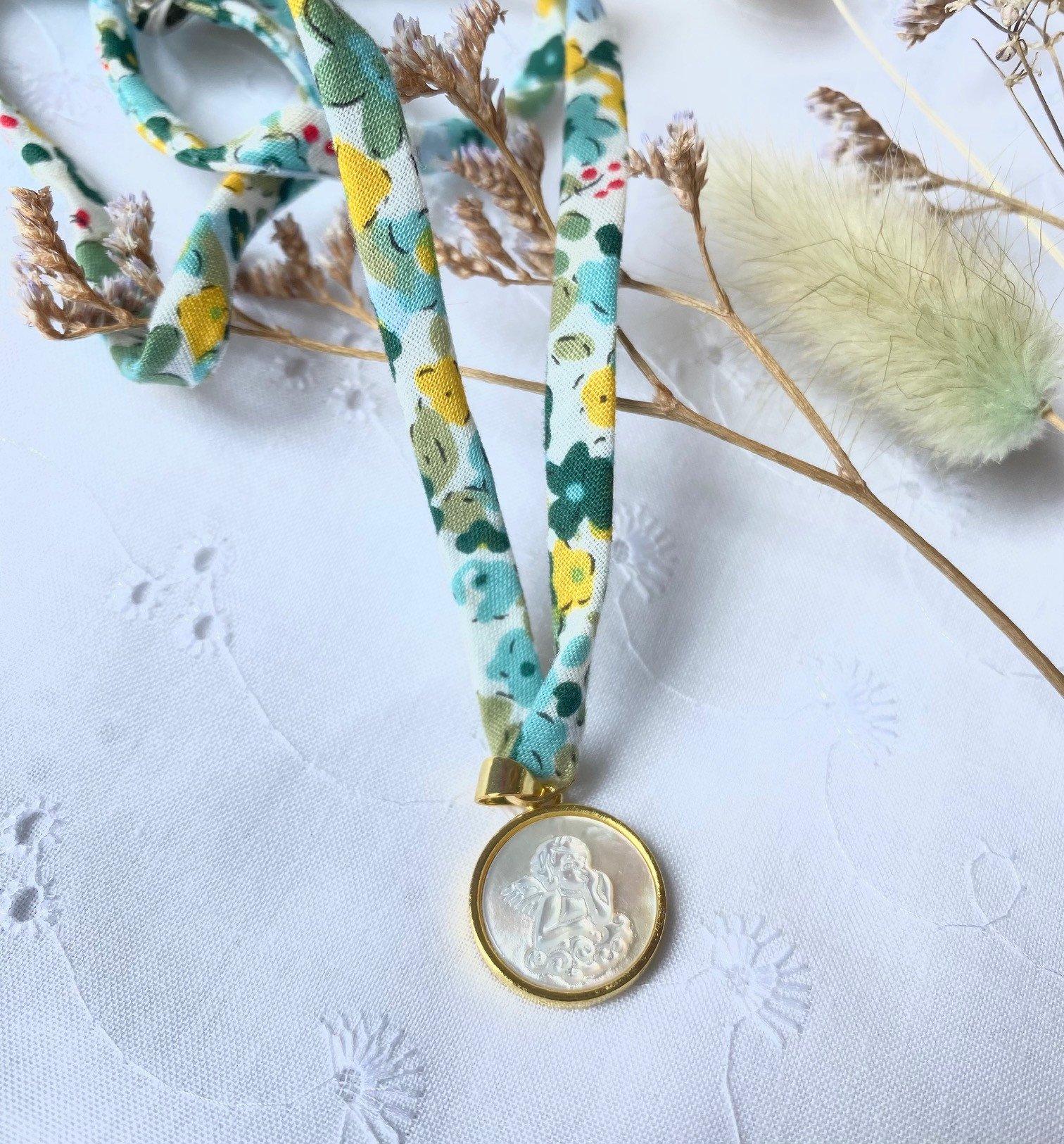 Vous cherchez un joli cadeau à offrir à votre fille, votre filleule, votre nièce ou à une amie pour une occasion particulière ou juste pour faire plaisir ? Ce collier en nacre "mon ange" et son cordon fleuri style liberty sera un petit présent parfait !