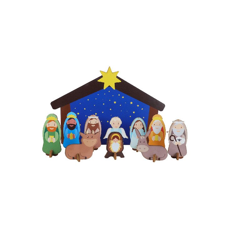 Offrez à votre enfant ou votre filleul cette crèche en bois, à monter soi-mème ! Ses personnages au dessin tendre et coloré, son décor étoilé et son format idéal conviendront parfaitement aux enfants dès 3/4 ans !
