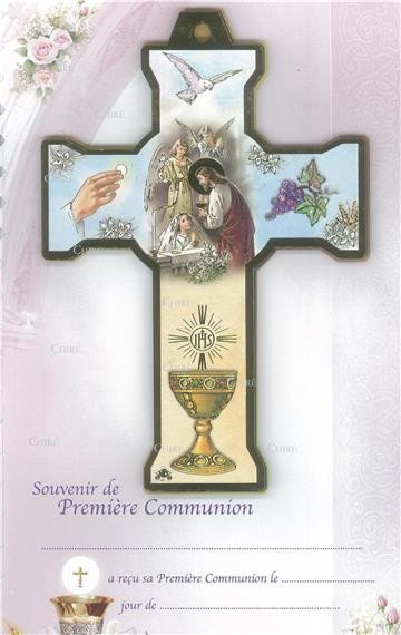 La croix est en bois compressé avec une image collée et redorée. Cette croix est accompagnée d'un certificat de première communion.