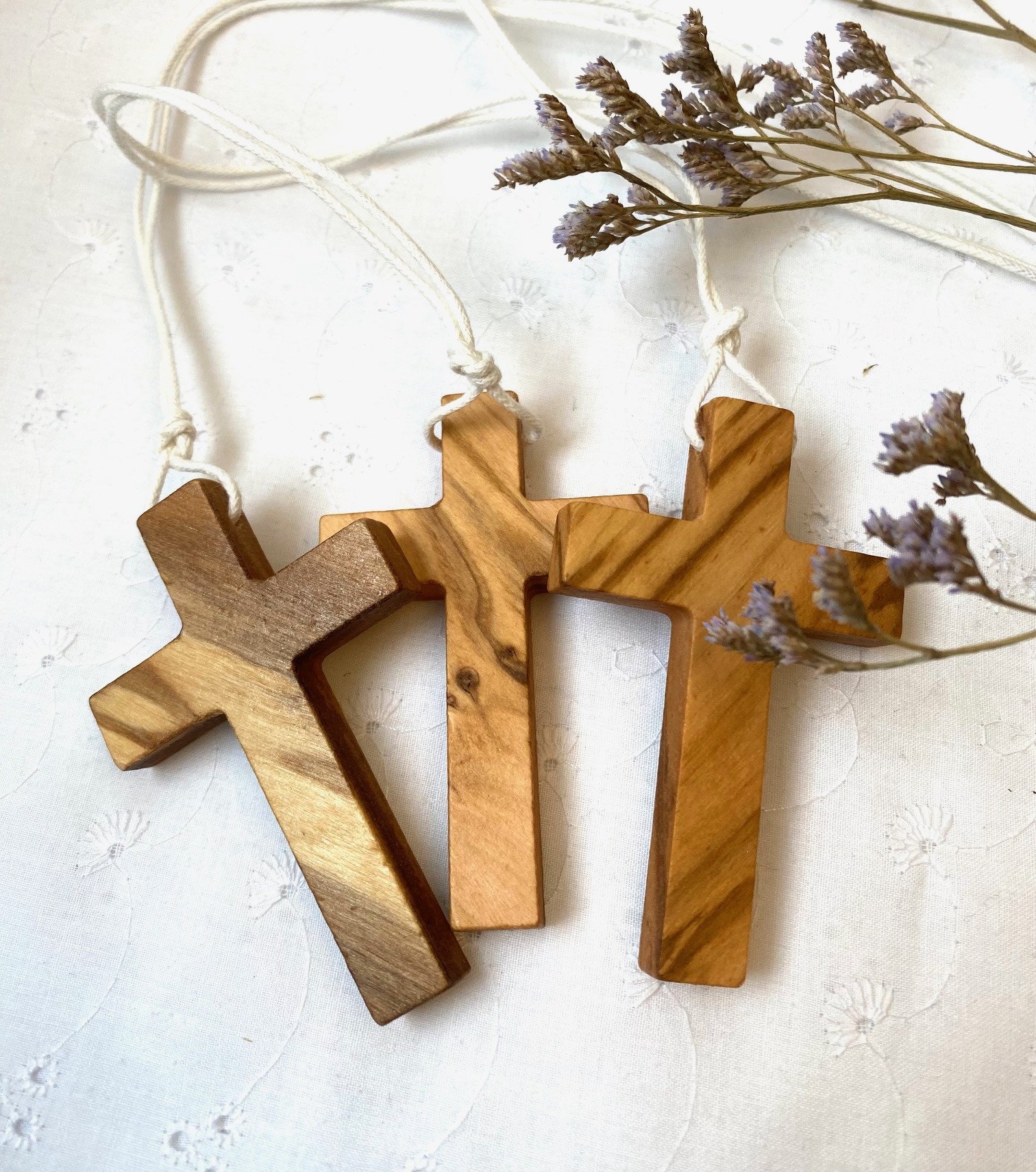 Très jolie croix d’aube en bois d’olivier, livrée avec un fin cordon.
