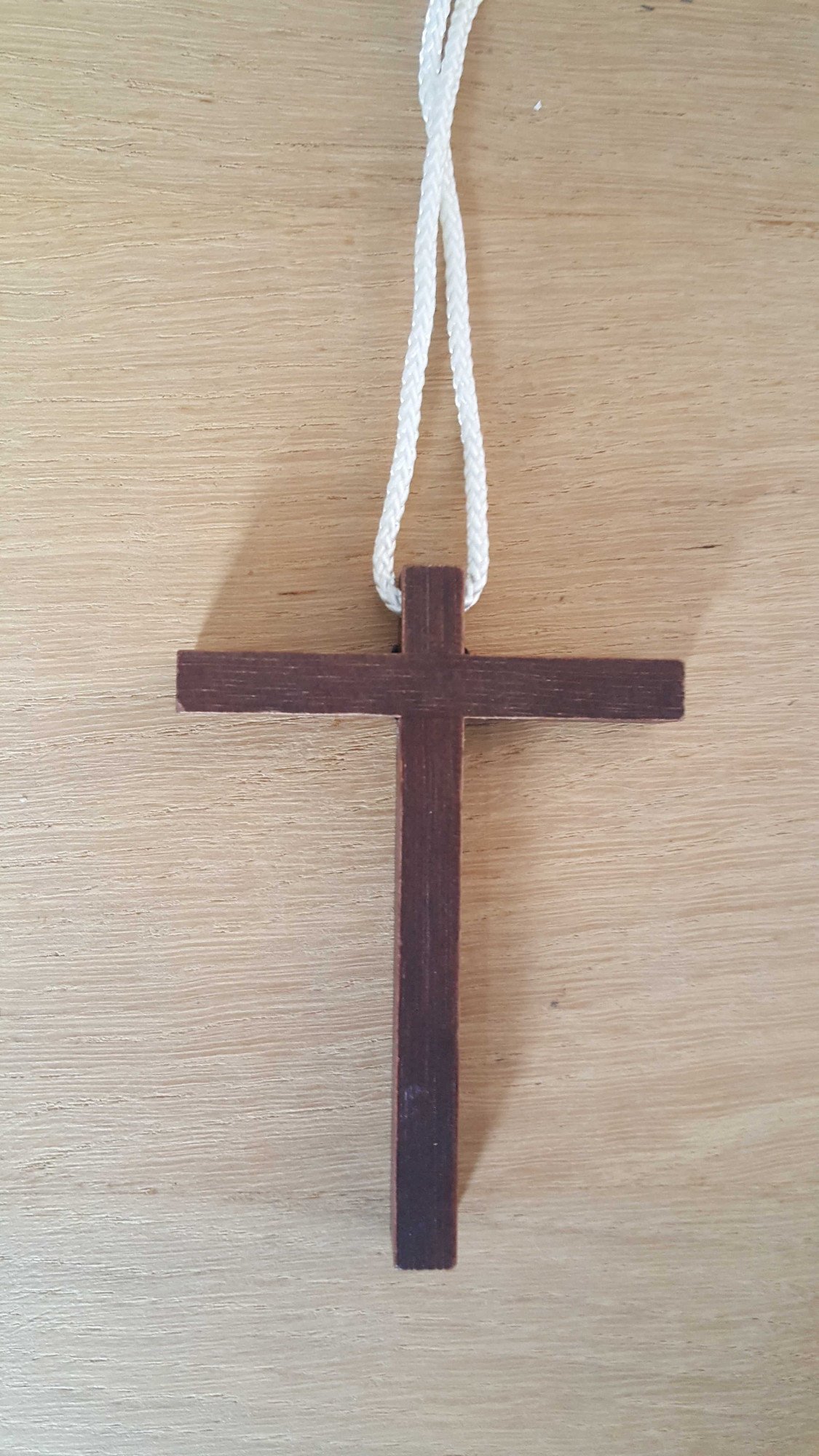 Très jolie croix d’aube en bois marron foncé, très fine, livrée avec son cordon.